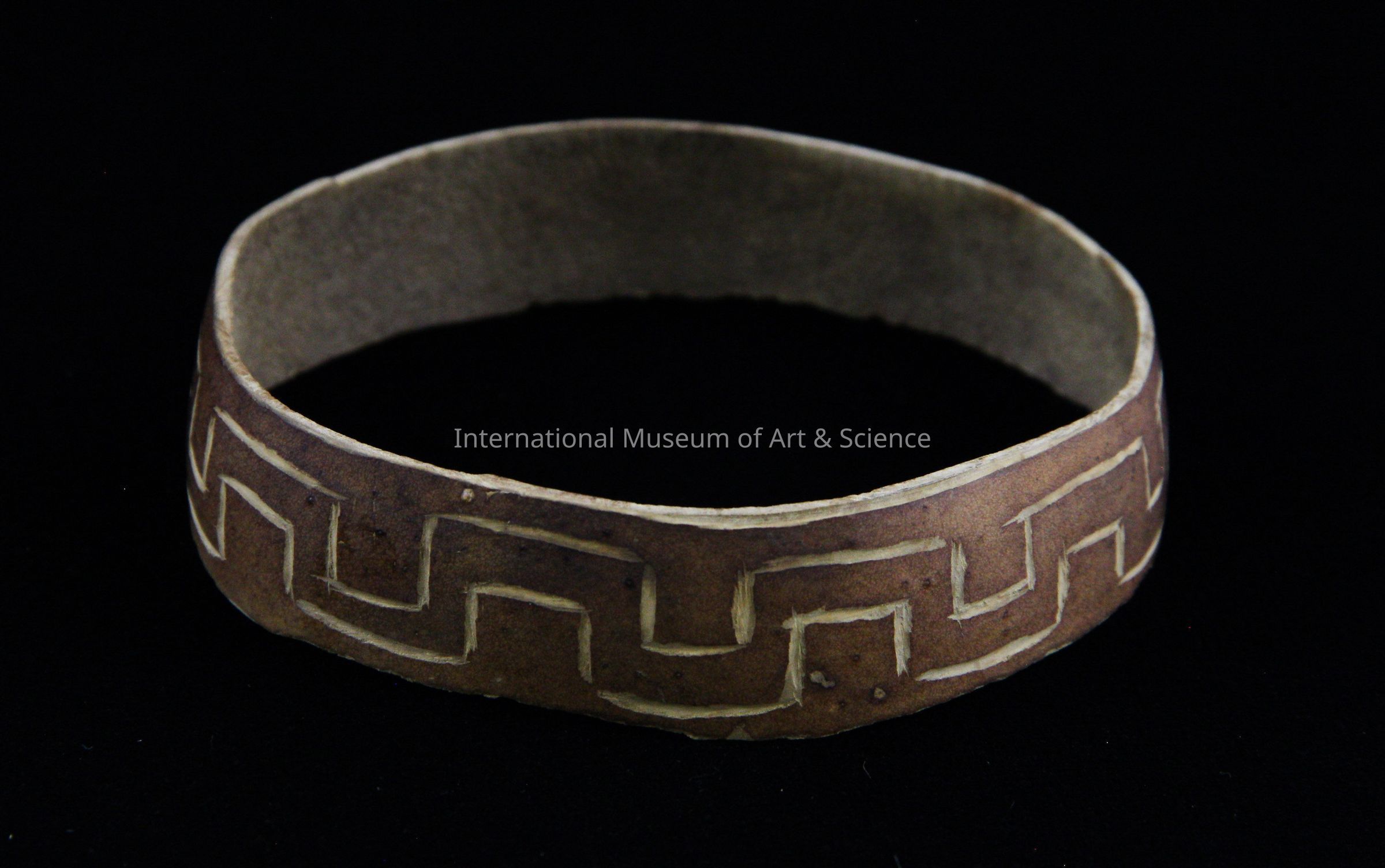 A stand/base carved from a gourd. The base is uneven height all around, 7/8" is tallest measurement. Carved around the base is a geometric design.Dimensions