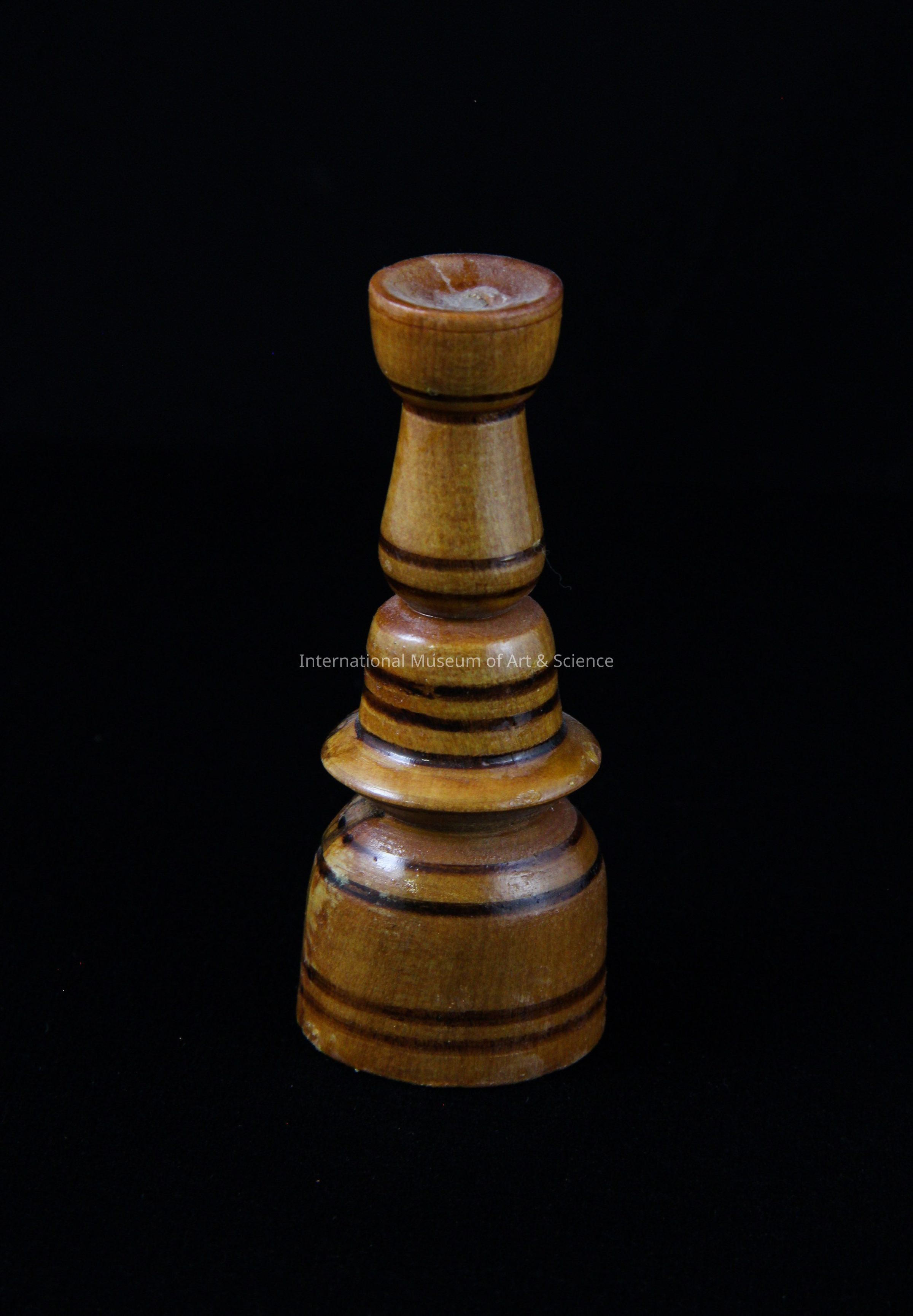 A wood carved base to a balancing toy. The piece is cylindrical in shape with the top tappering in to a small diameter. The base is stained a medium brown with dark brown lines painted on for decoration.Artwork Details