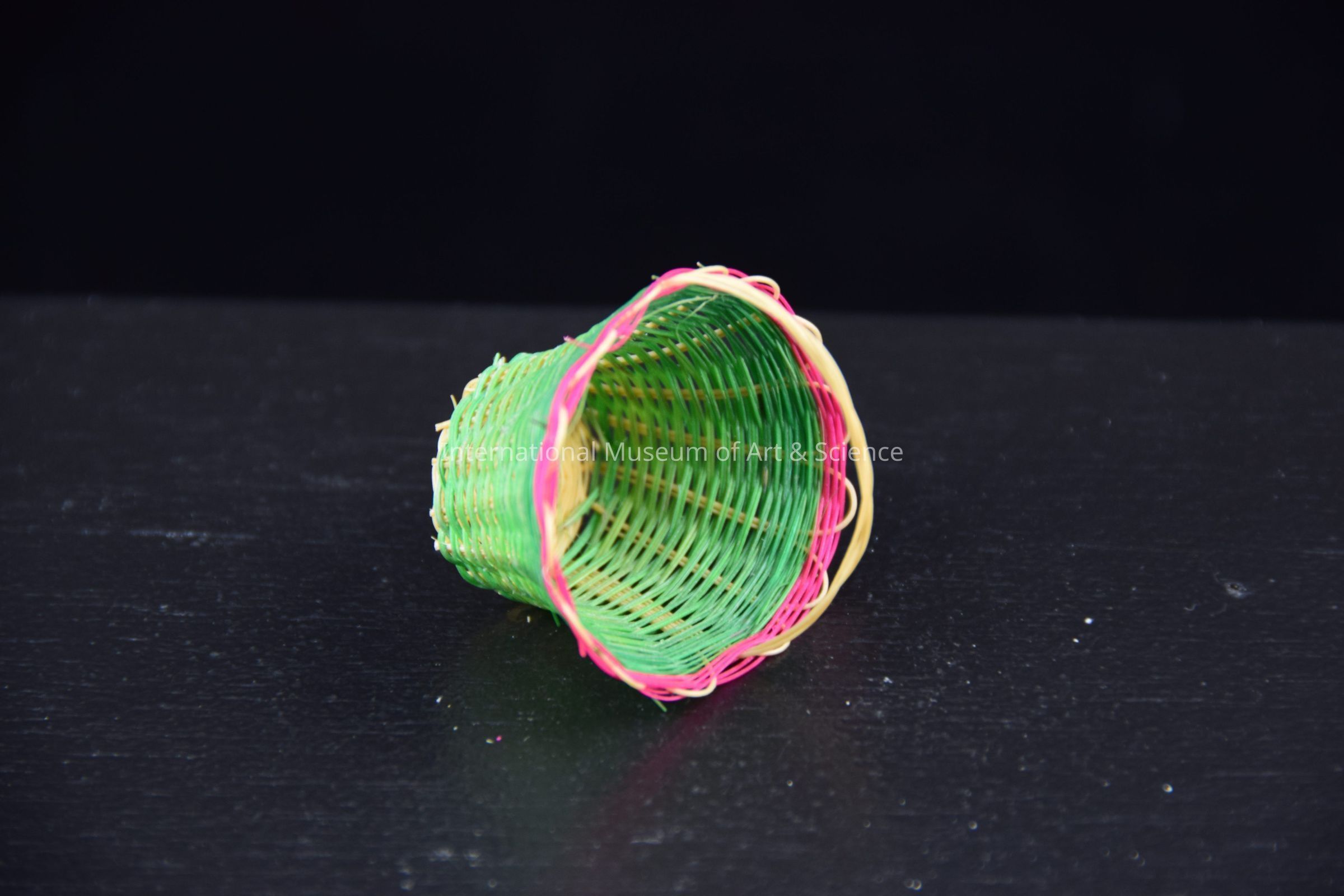 A miniature basket, woven from ixtle. The basket is woven from both natural ixtle and ixtle that has been dyed green, and pink. The body of the basket is green, while the rim is pink. The basket has a wide mouth and a twisted handle.Dimensions