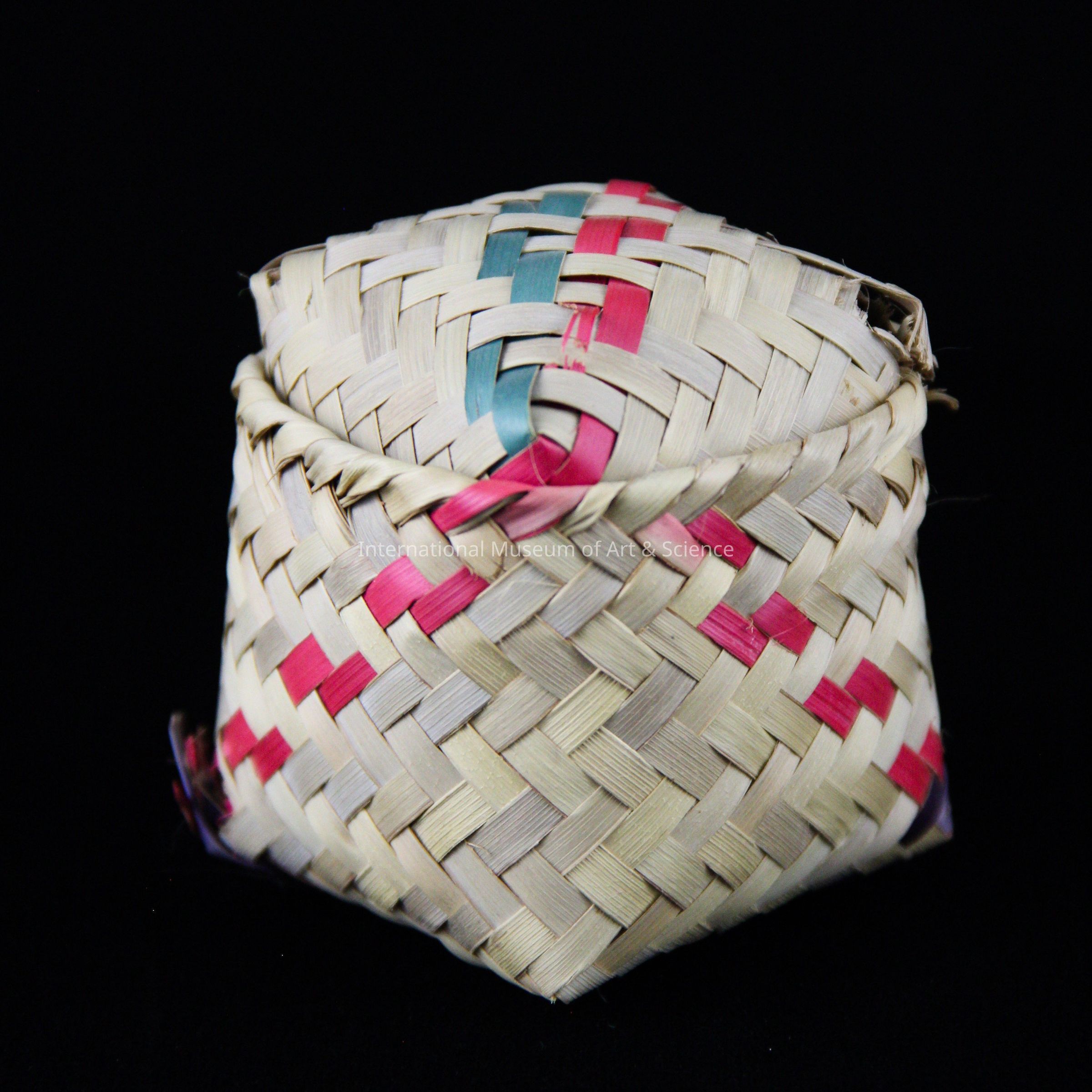 A basket with lid. The basket has a square base and a round mouth. The basket is woven from dried palm leaves, some of which have been dyed puplre and pink.