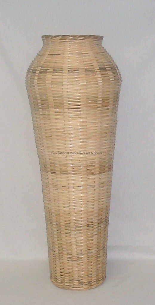 A tall basket. The basket has a tall cylindrical body form with a wide shoulder top. The sotol is natural in color.Artwork Details