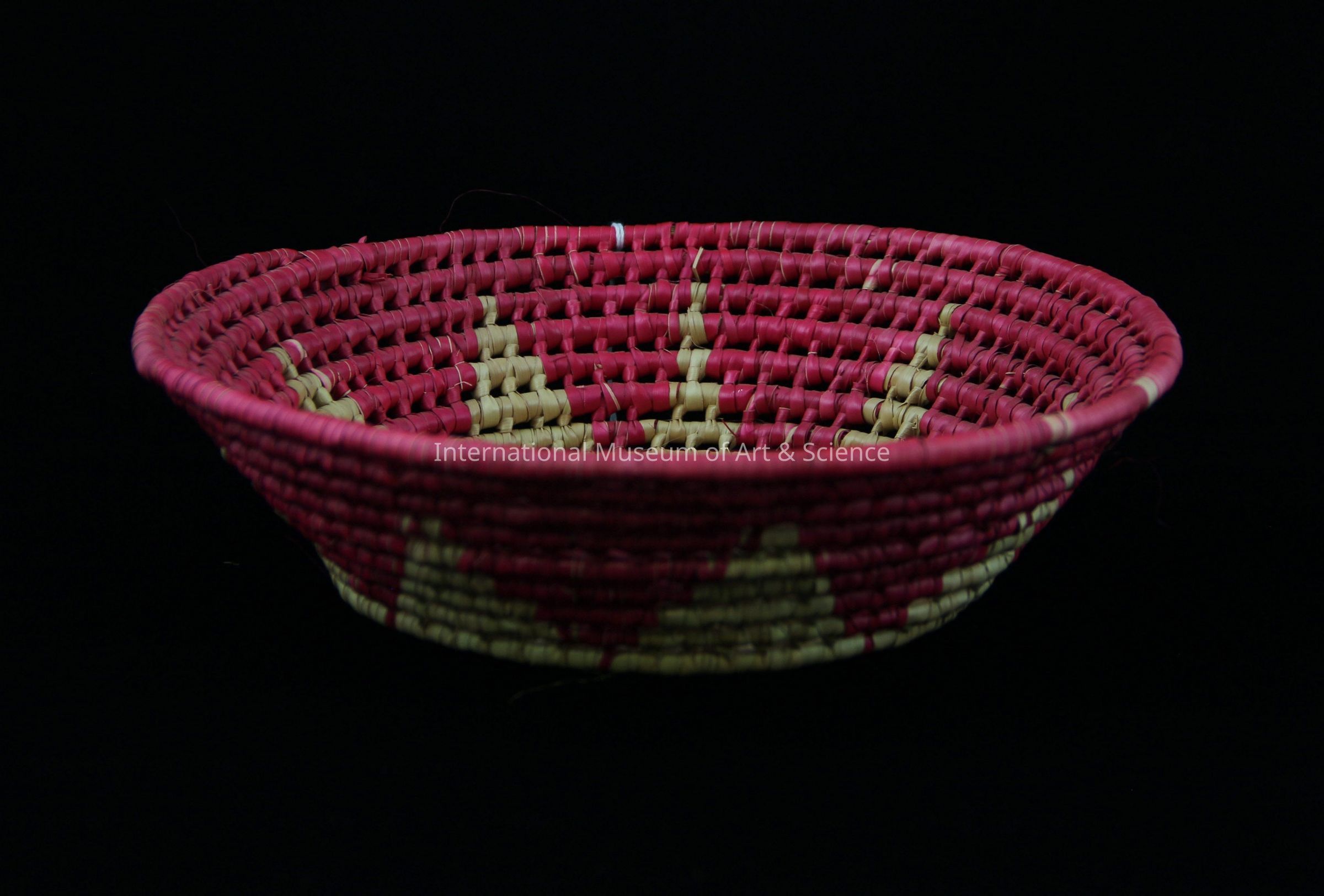 A basket woven of natural palm leaves. The basket is woven in the coil techique. The base of the bowl is natural in color with natural colors triangles around the edge were the bowl meets the base, creating a star design. The rest of the bowl is magenta in color.Dimensions