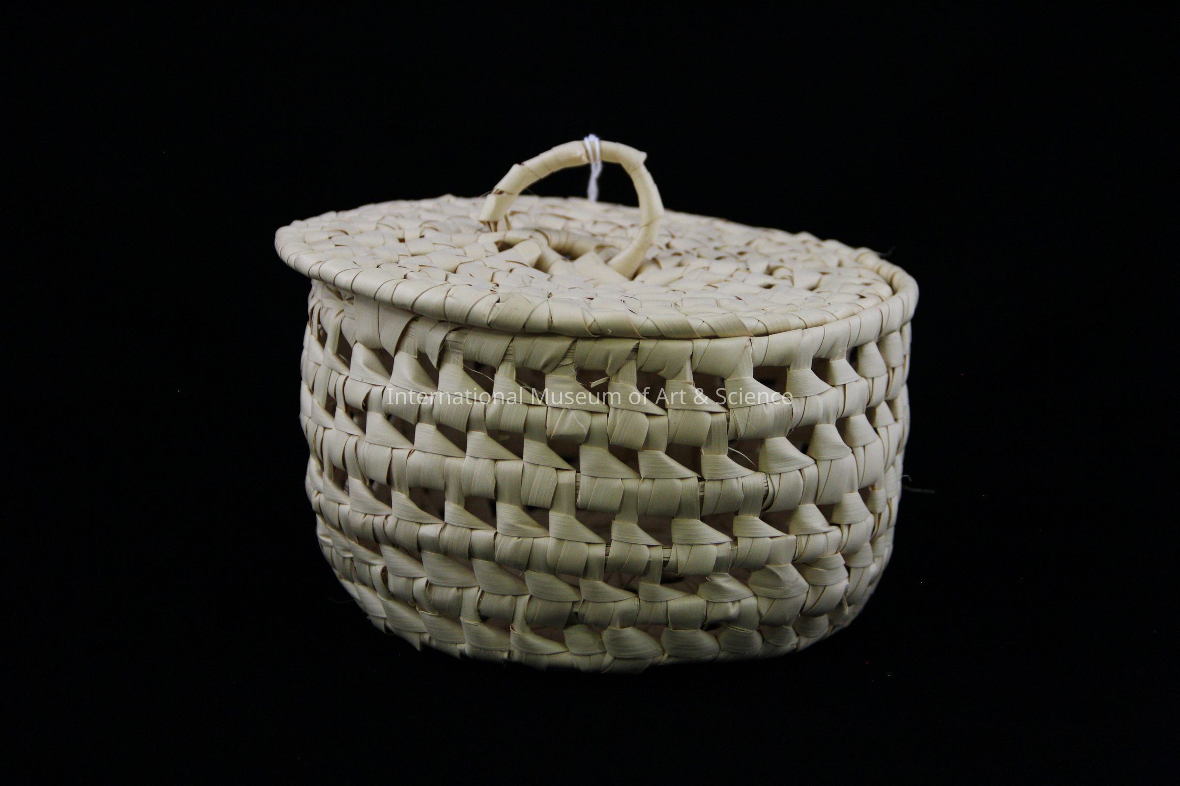 A tortilla basket. A bound woven basket of guano (palm leaf) with attached lid of same material. The lid has small hoop woven into it serving as a handle. Natural color.Artwork Details