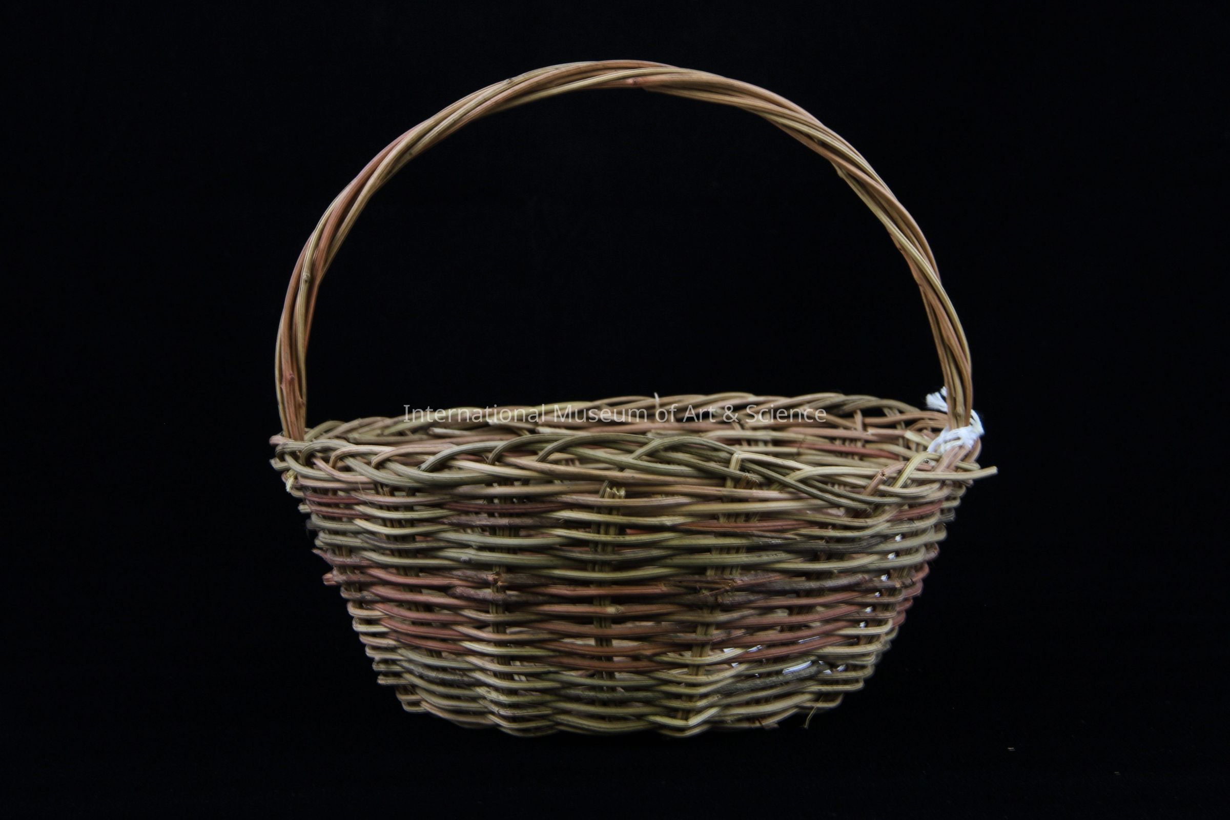 A woven basket. The basket is woven of 1/8" natural and red reed. The rim of the basket is cross woven of 3 braided strands of natural reed, followed by 2 strands of natural reed, then 2 strandsof red reed, followed by 5 strands of natural reed, 4 red reed and 4 of natural reed. The remainder of the basket is of natural reed. The handle is cross woven of 7 strands of natural bejuco.