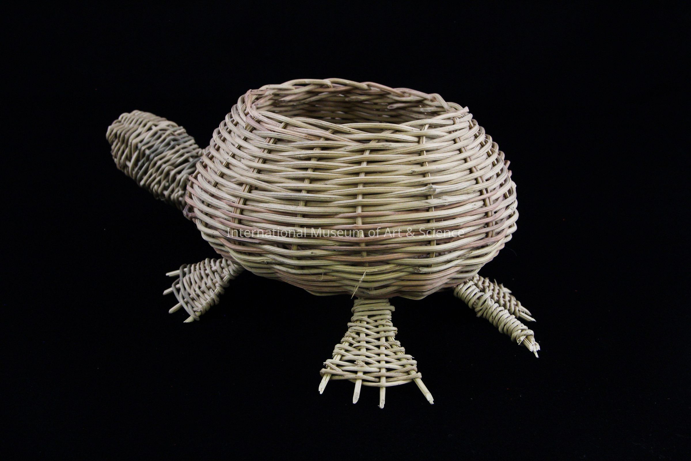 A woven basket in the shape of a turtle. The head, neck, and legs are of natural, brown and green reeds. The basket body is of natural reed with a red band of reed woven into it about 3/4's of the way down the basket body. One foot of the basket has a band of green comprised of 3/4 strands of bejuco.Made/Created