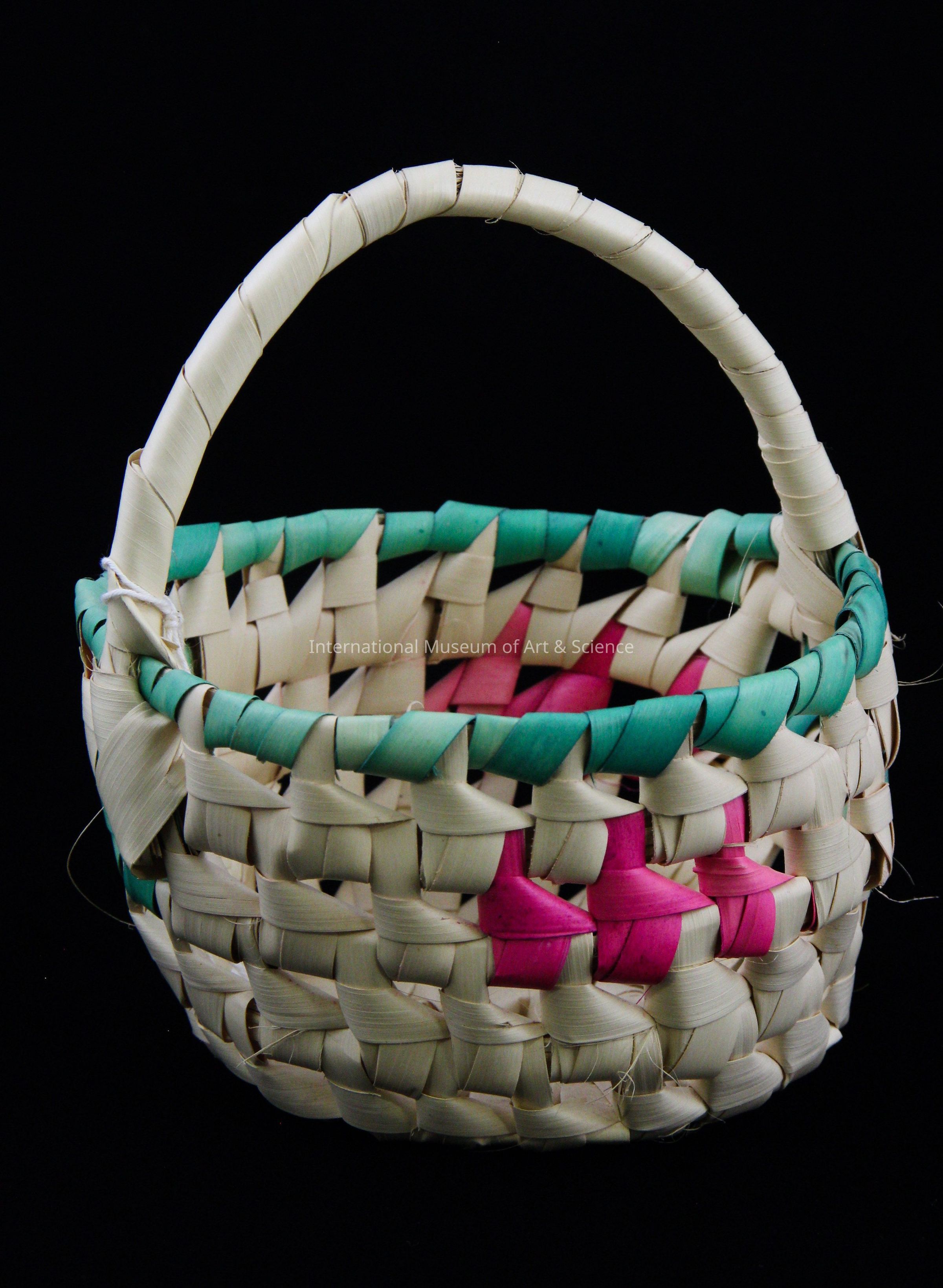 A small flower basket made of natural and dyed palm leaves. it has a curved handle wrapped with natural palm leaves, a bowl-shape body with round rows of wrapped strips woven, leaving openings. The mouth rim of basket is wrapped in green dyed leaves. There are small sections of green and pink strips, with the majority of the basket a natural cream color.Made/Created