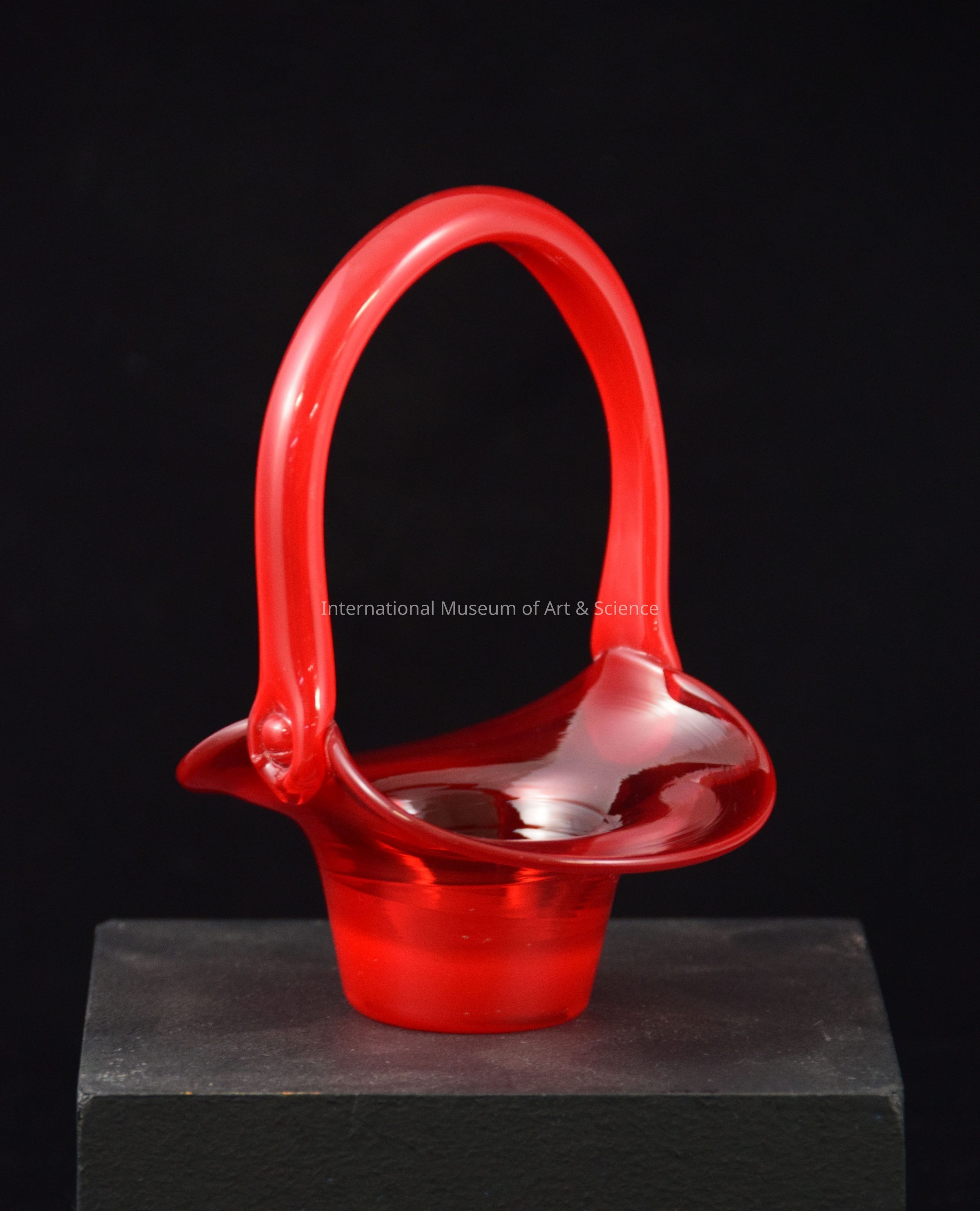 A red glass basket with long cured handle. it has a shallow interior, and hanged mouth top. round base.Made/Created