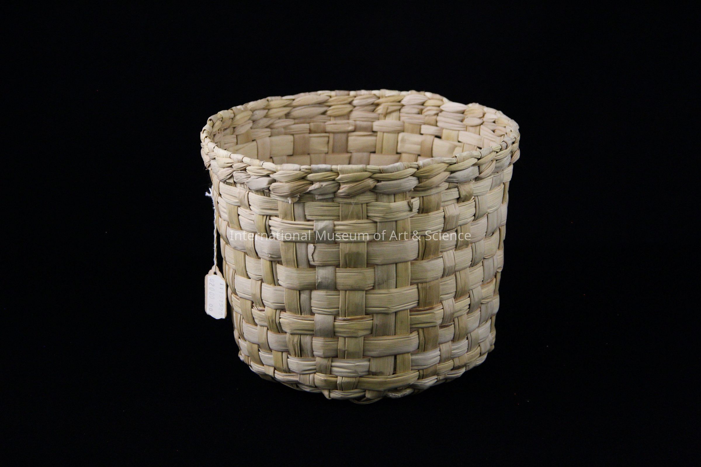 A woven basket. A small deep basket made of natural green palm leaves. The spherical form of the basket has horizontal and vertical woven leaves. It has a round mouth and base.Dimensions