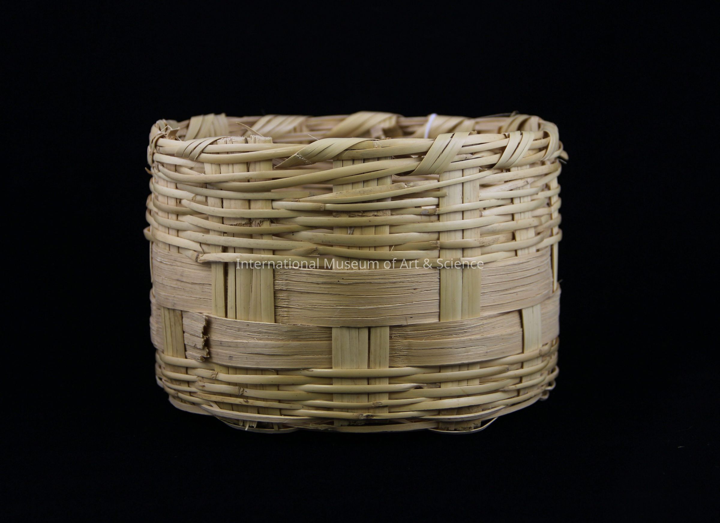 Basket with lid constructed of light, natural unfinished reed using a plaited weaving technique. The lid is constructed of 1/2 cm. reed woven around 3 cm. strips which are arranged dagonally. The plaited weaving technique is sepeated on the baskent bottom where the sides are constructed of 1/2 cm tula woven horizonally around vertical elements ranging in size from 2.0 to 3.5 cm. two 3 cm. bands wun horizontally around the bottom half of the basket.Artwork Details