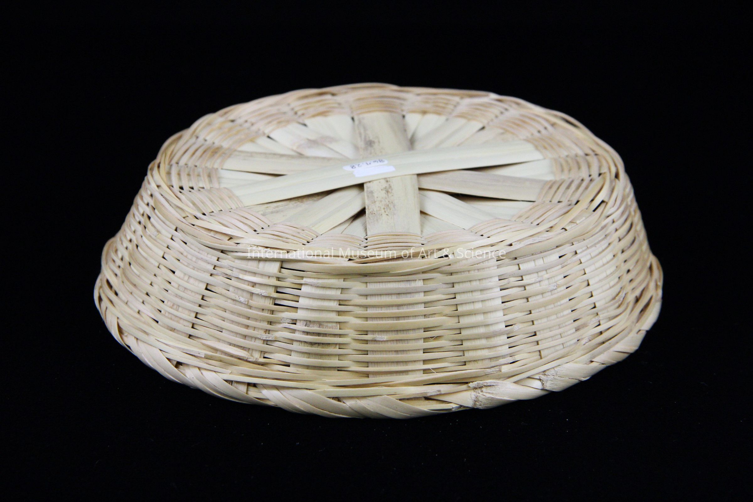 A woven basket made of carrizo de barra. It is natural color basket woven with cross-start at base in a bowl shape. The basket is shallow with wide vertical bands thatched with narrow horizontal strips, and wrapped strips at the rim.Dimensions