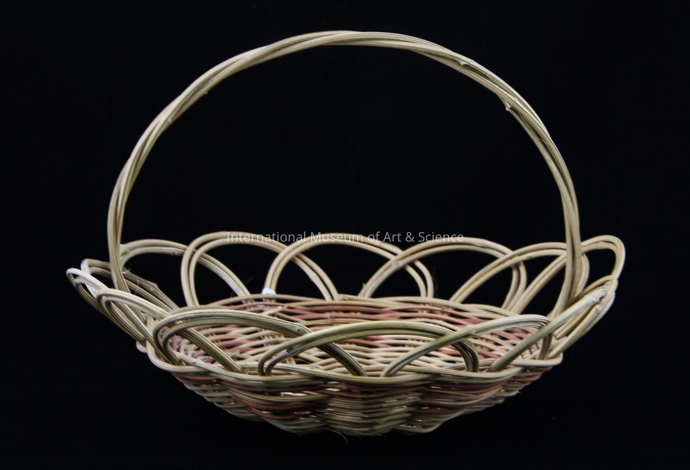A scalloped edged basket. The scallop design serves as a framework upon which the basket is woven. The scalloped portion of the basket is of 1/4" reed. The remainder of the reed is of 1/8'". The basket body is woven of natural reed with a red band of reed beginning after the 3rd strand of natural reed. 7 strands of red are woven into natural reed. The scalloped rim of the basket circles the basket at the width of 1 1/2". The handle is of natural bejuco.Made/Created