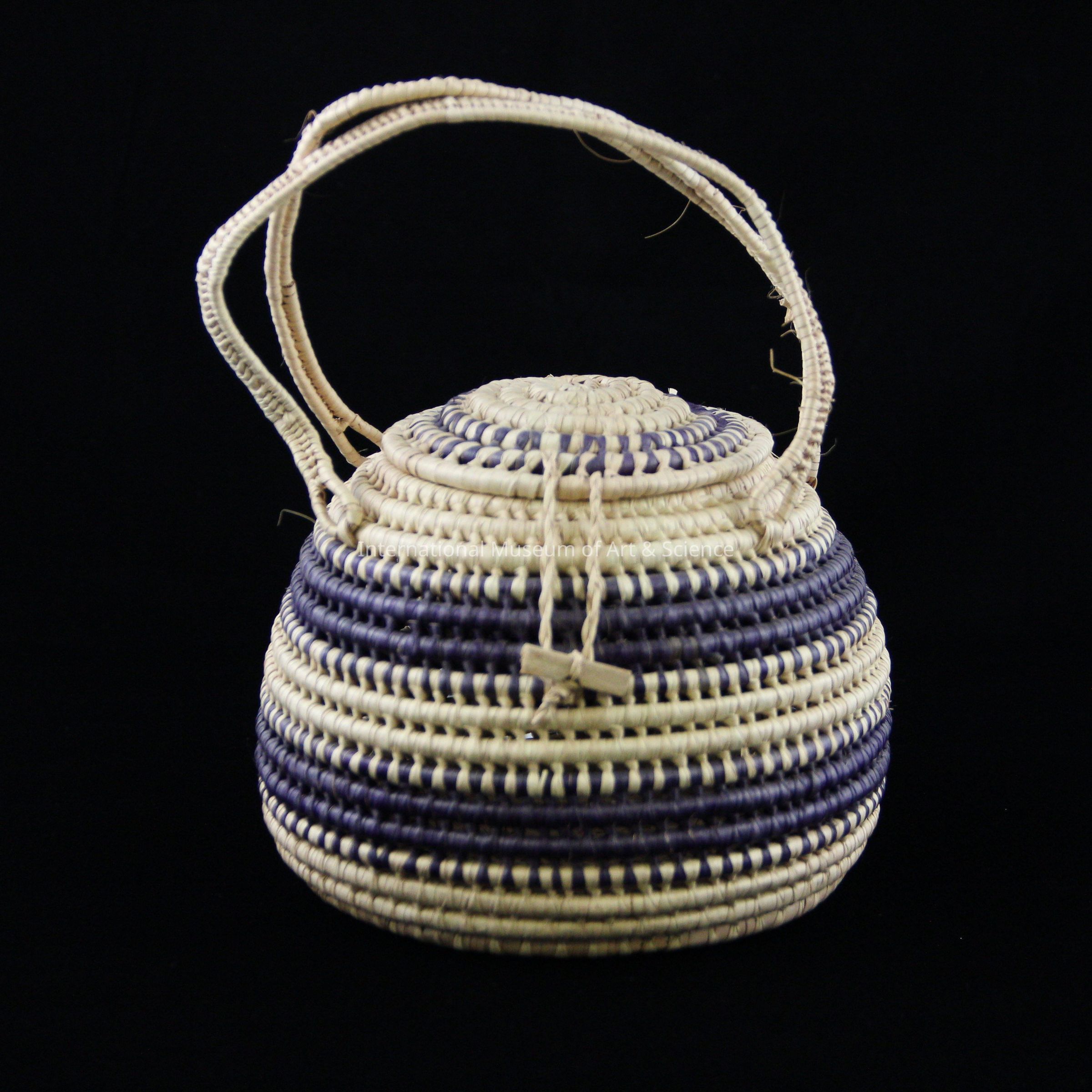 A lidded basket woven into spherical form with dried palm leaves. There are two woven handles. The lid portion is woven of purple dye palm leaves, the body has purple sections, and the lid ties at body center.Dimensions