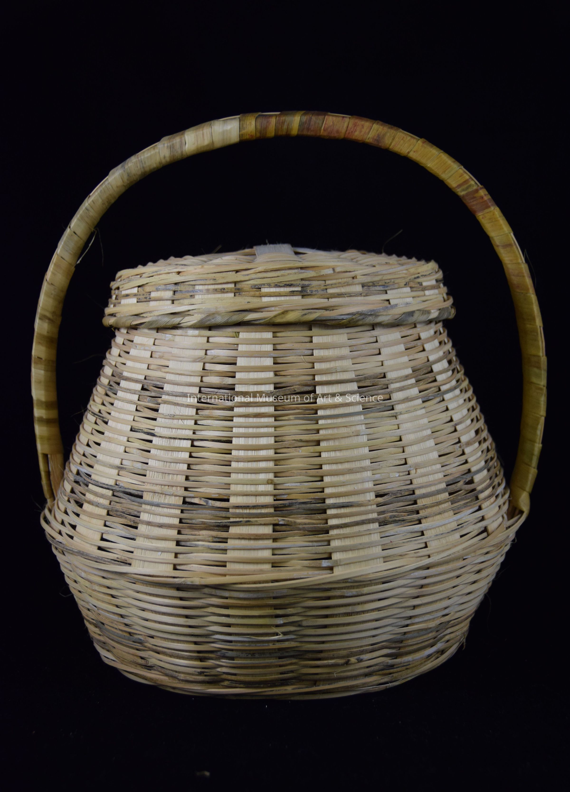 A otate (bamboo) and sotol basket. The basket has an arched handle and a round matching lid. The piece is in natural colors of beige and green.Artwork Details