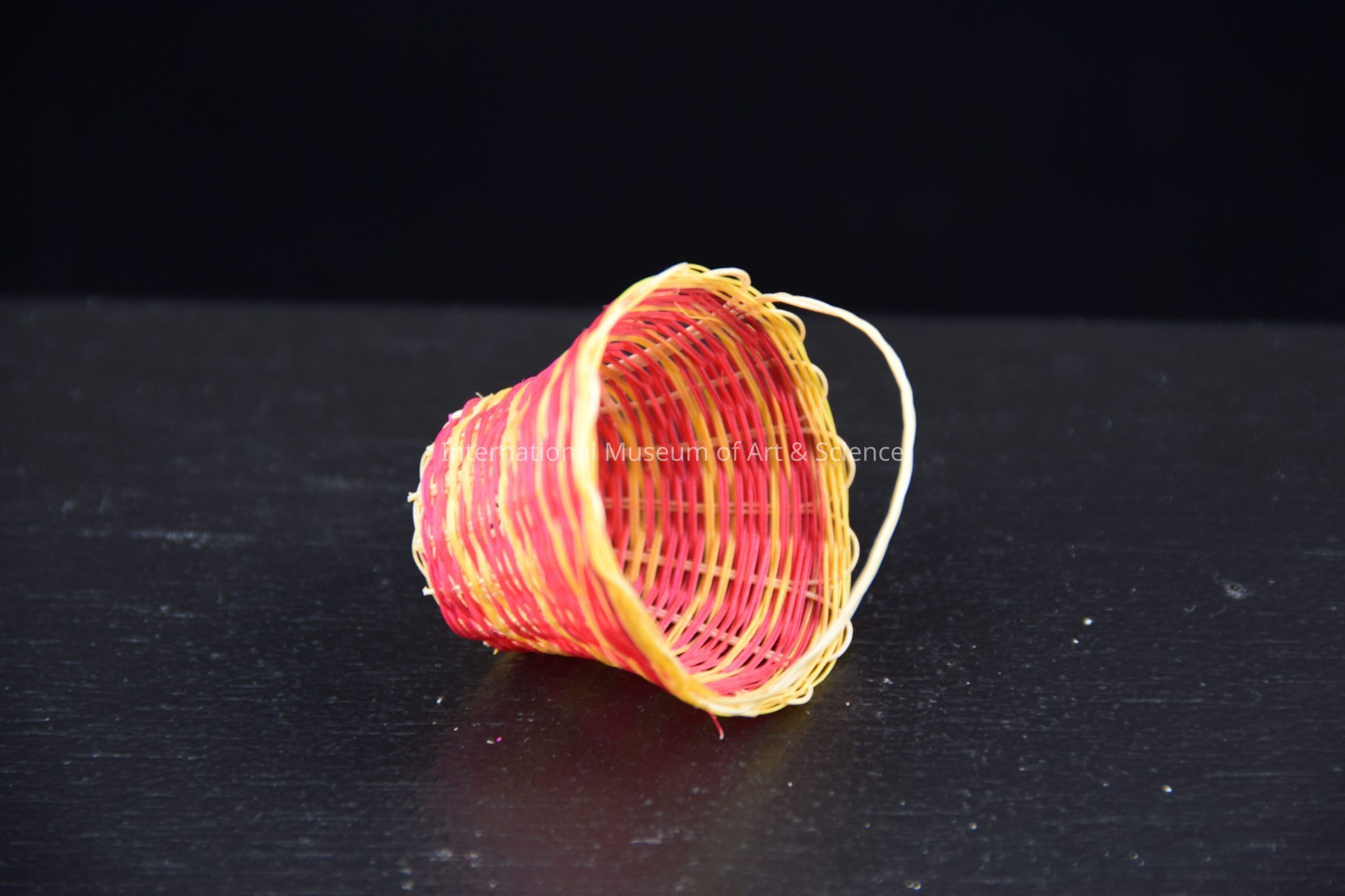 A miniature basket, woven from ixtle. The basket is woven from both natural ixtle and ixtle that has been dyed yellow, and pink. The basket has been woven so that the pink, yellow and green colors stripe the exterior. The basket has a wide mouth and a twisted handle.Dimensions