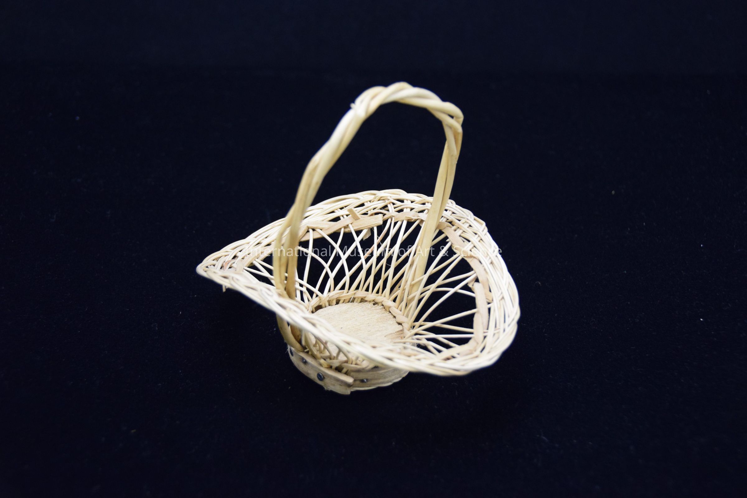 Miniature basket with handle. Natural color; twisted handle; downward on sides.