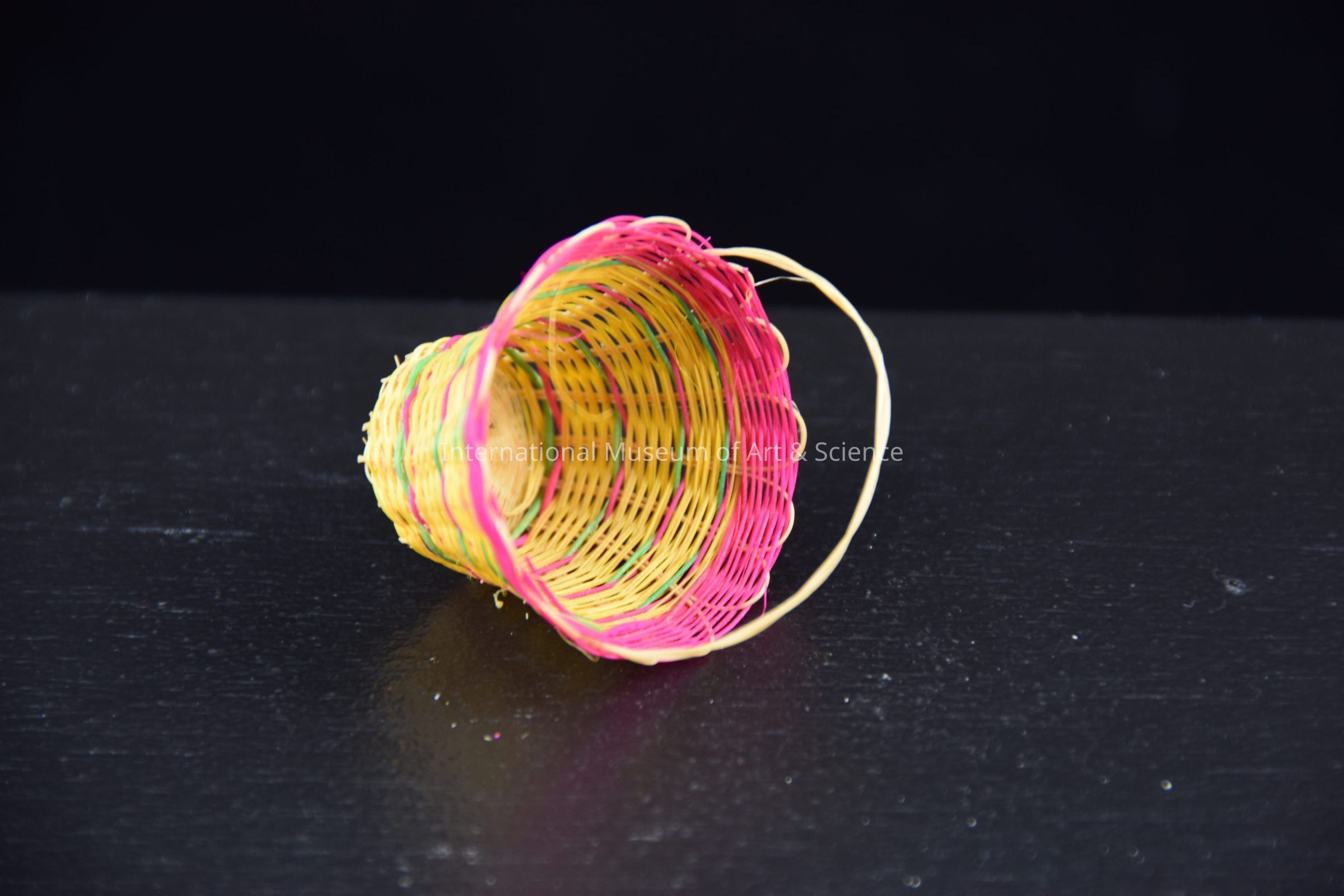 A miniature basket, woven from ixtle. The basket is woven from both natural ixtle and ixtle that has been dyed green, yellow, and pink. The basket has been woven so that the pink, yellow and green colors stripe the exterior. The basket has a wide mouth and a twisted handle.Dimensions