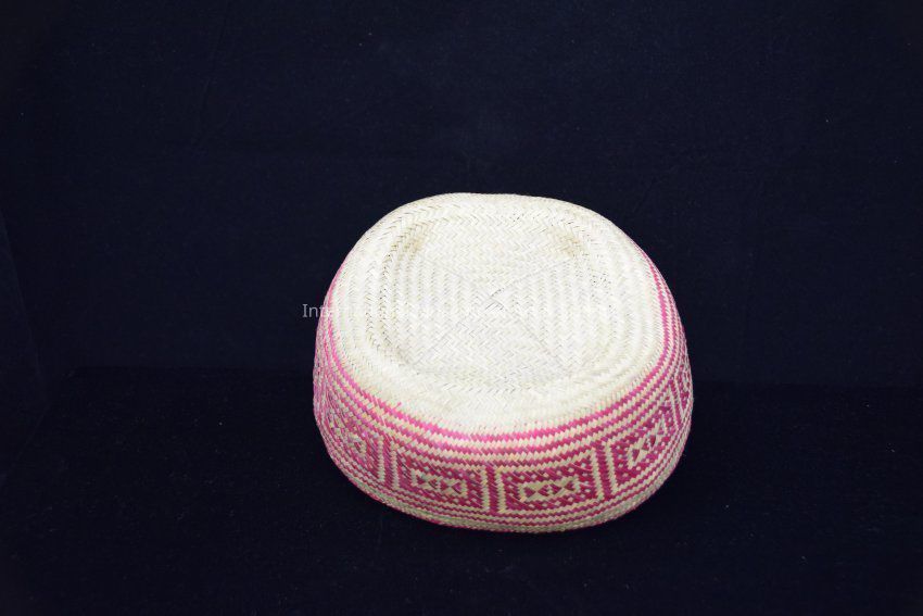 A basket with matching lid. Dried and split palm leaves, finely woven into intricate, geometric motifs, bright pink/natural. Rectangular motifs predominant. Depressions, stitched cross of ixtle on bottom of basket, top of cover.Artwork Details