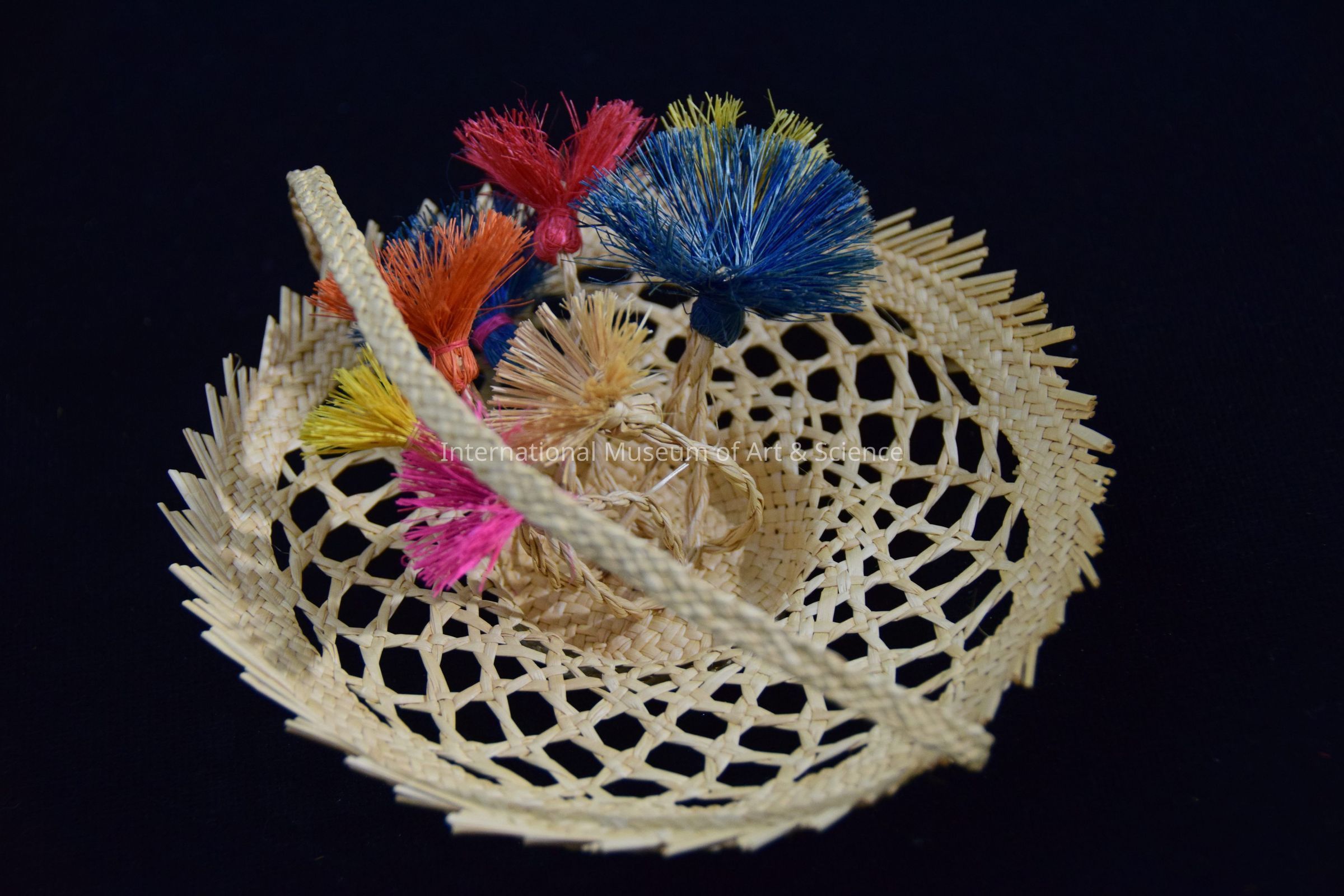Basket With Flowers. Basket woven of fine off-white jipi leaves; curved braided handle; shallow body with openings; strips of tipi projected on the top rim; seven flowers with braided stems attached to the interiror center of the basket; flowers of yellow, blue, red, orange, natural, and mauve color; round base.Made/Created