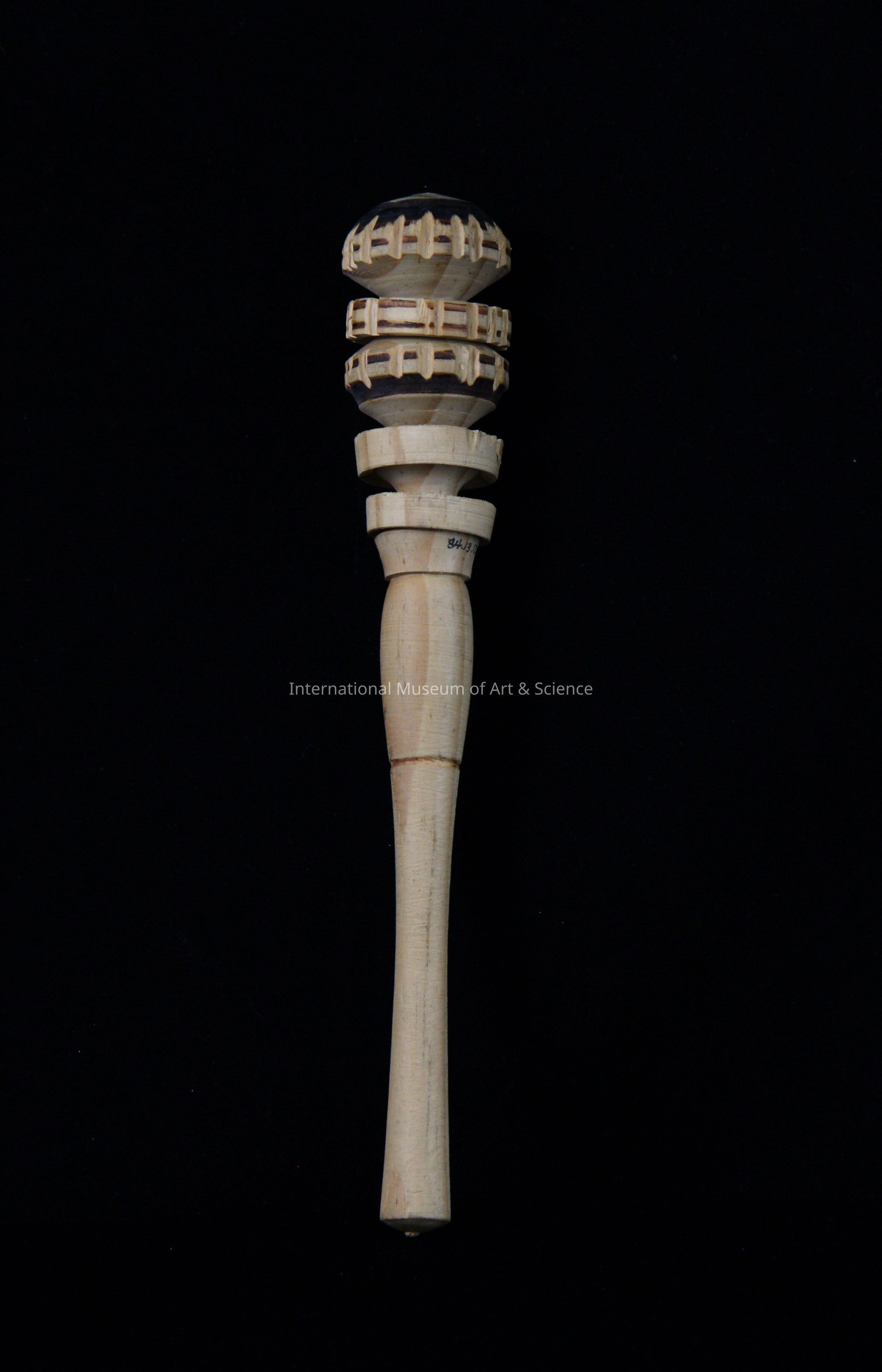 A wooden chocolate beater. It has a narrow handle. The top is in the shape of a ball and there are rings below which are kept in place by a wide circular carving. Decorations have been burned onto the piece.