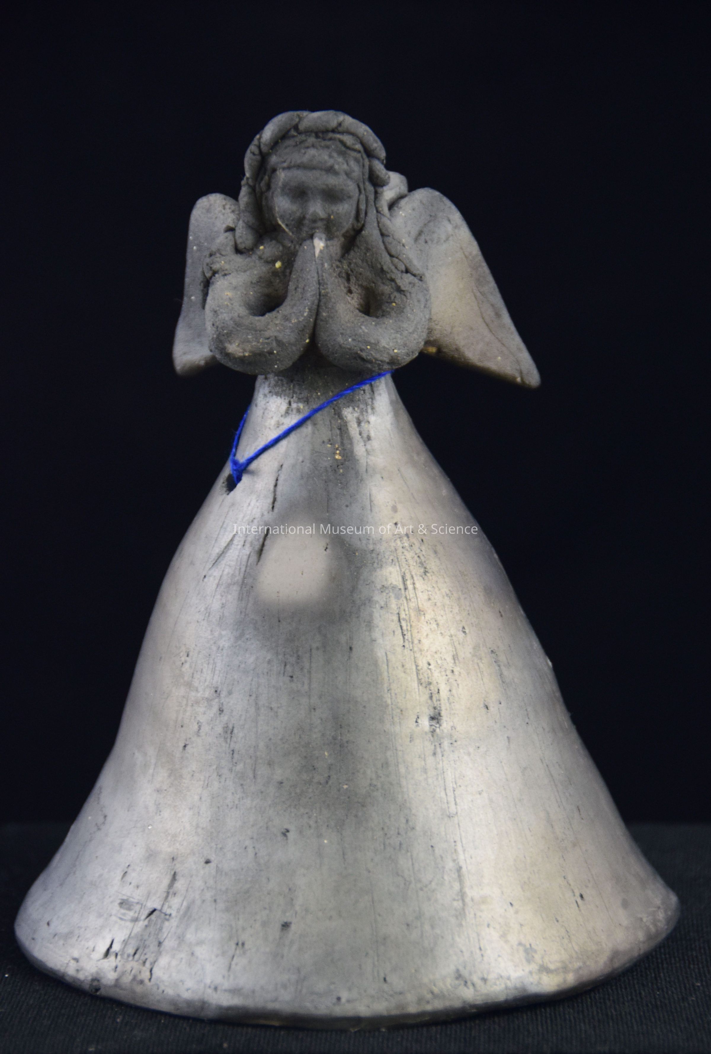 A ceramic bell and candleholder. The piece depicts an angel with her hands in a prayer pose. On her back between her wings is a place to hold a taper candle.Artwork Details