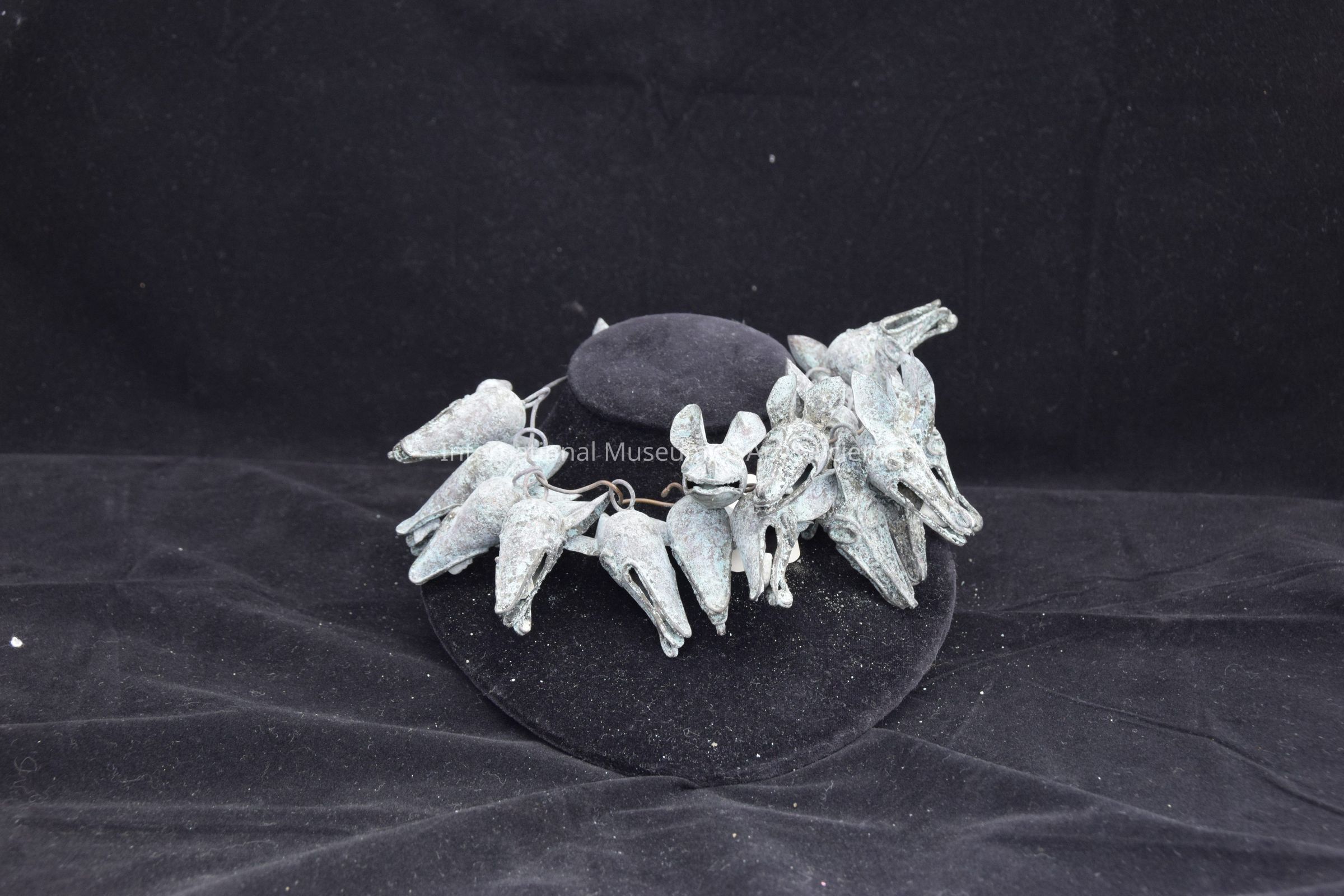 Nineteen copper ornaments in the form of coyote heads, pointed ears and long snouts, copper bells, wire eyes. Each one is approximately. small molded coyote heads suspended from long peice of wire like a necklace. hammered and soldered ornaments with wire appligue facial decorations.Dimensions