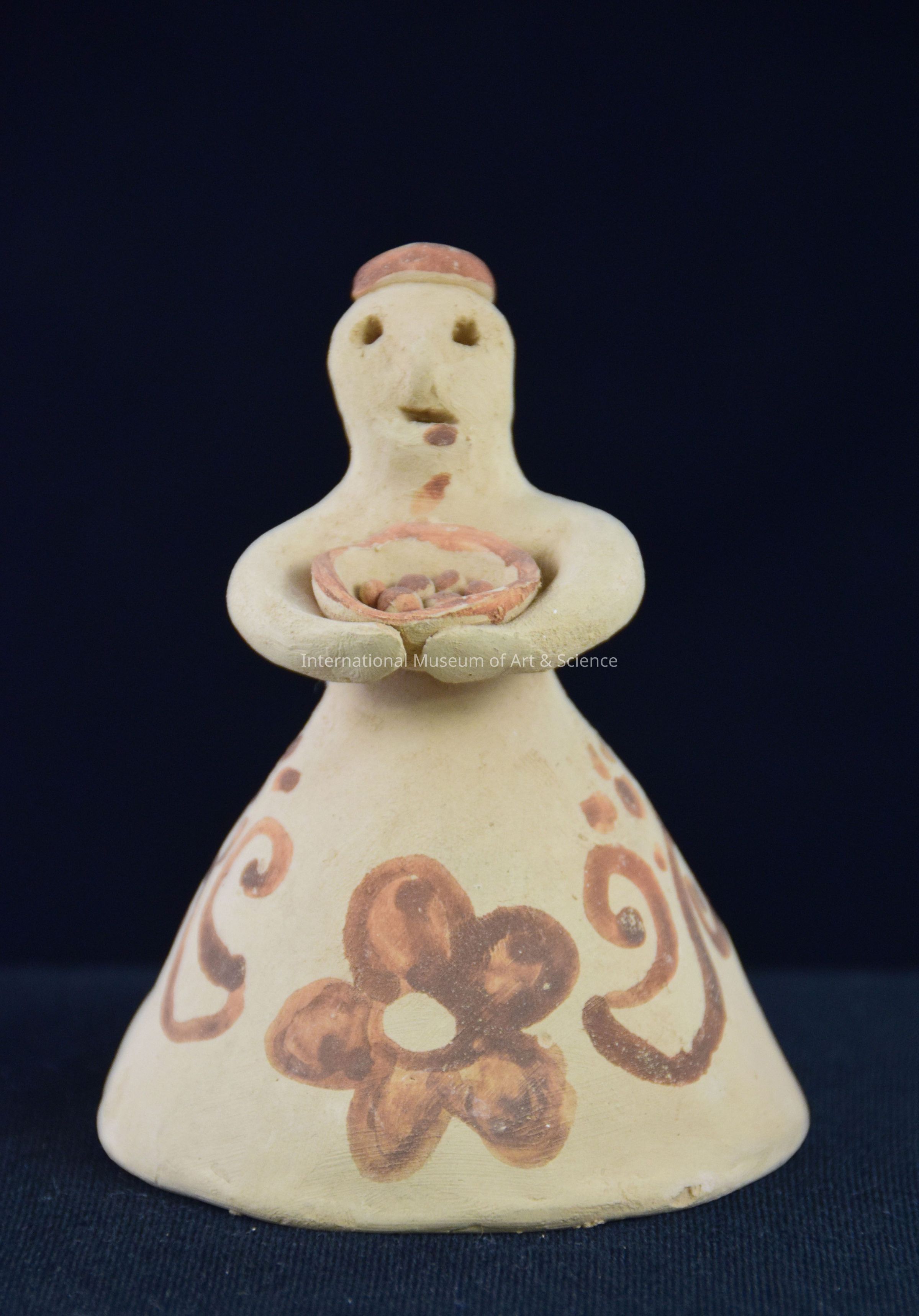Clay bell figure with painted design on skirt. The figurerine is holding a basket.