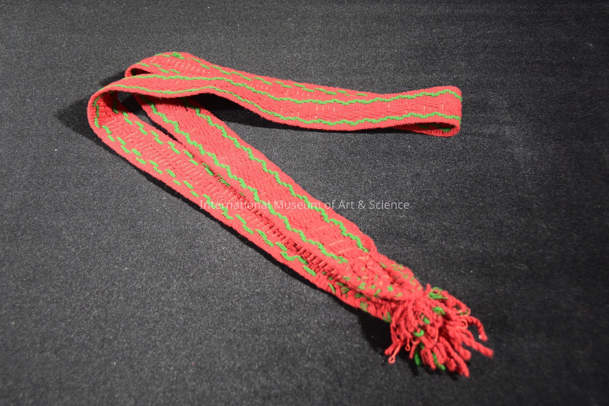 Faja (belt). Maroon with 2 green stripe patterns at sides, red stripes sporadically through center; ends-- 4 long tied braids, tassel.Artwork Details