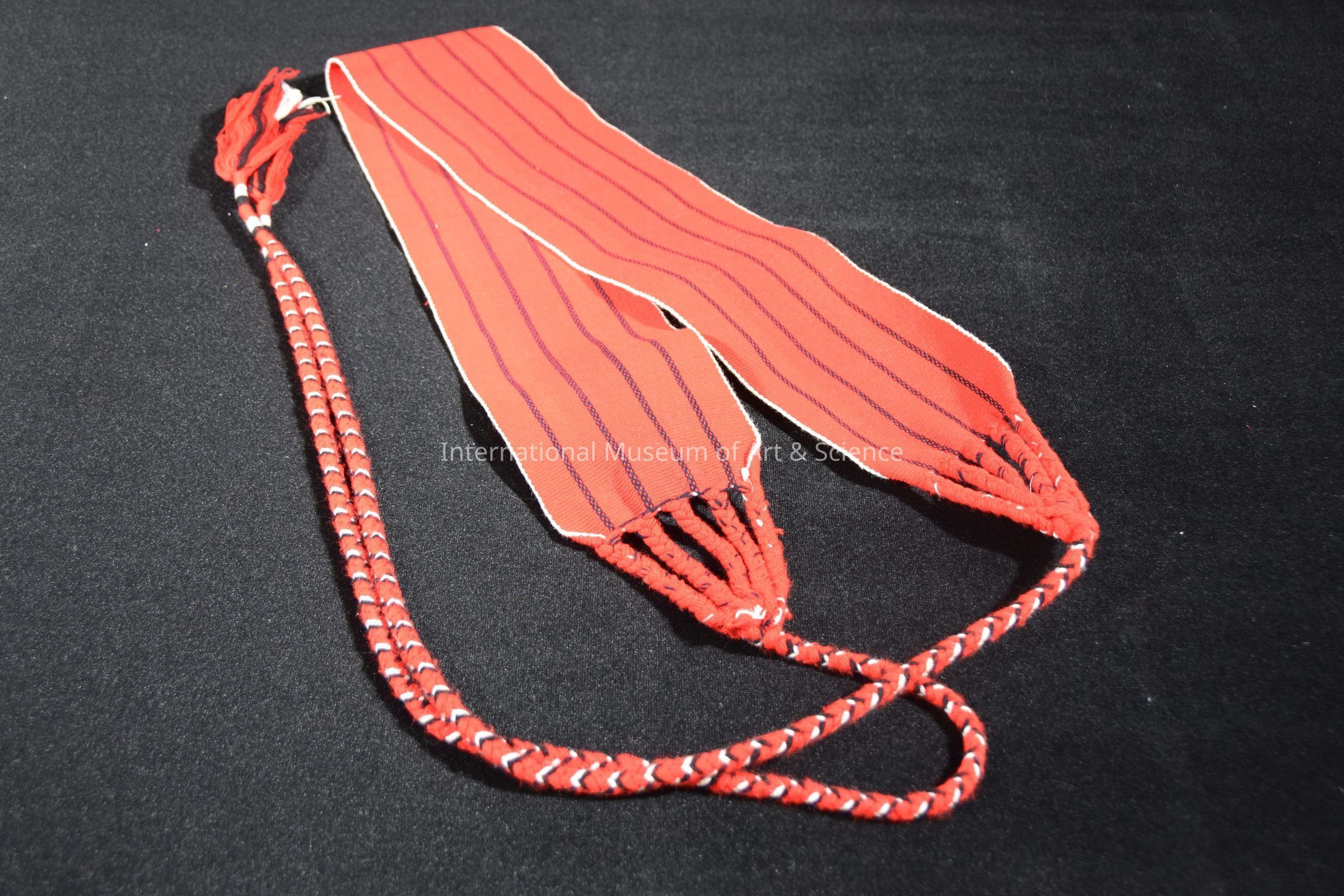 Faja (belt). Red with 4 black patterned stripes, white edges; ends braided in long, tri-color tassels; end wrapped & then loose.Dimensions
