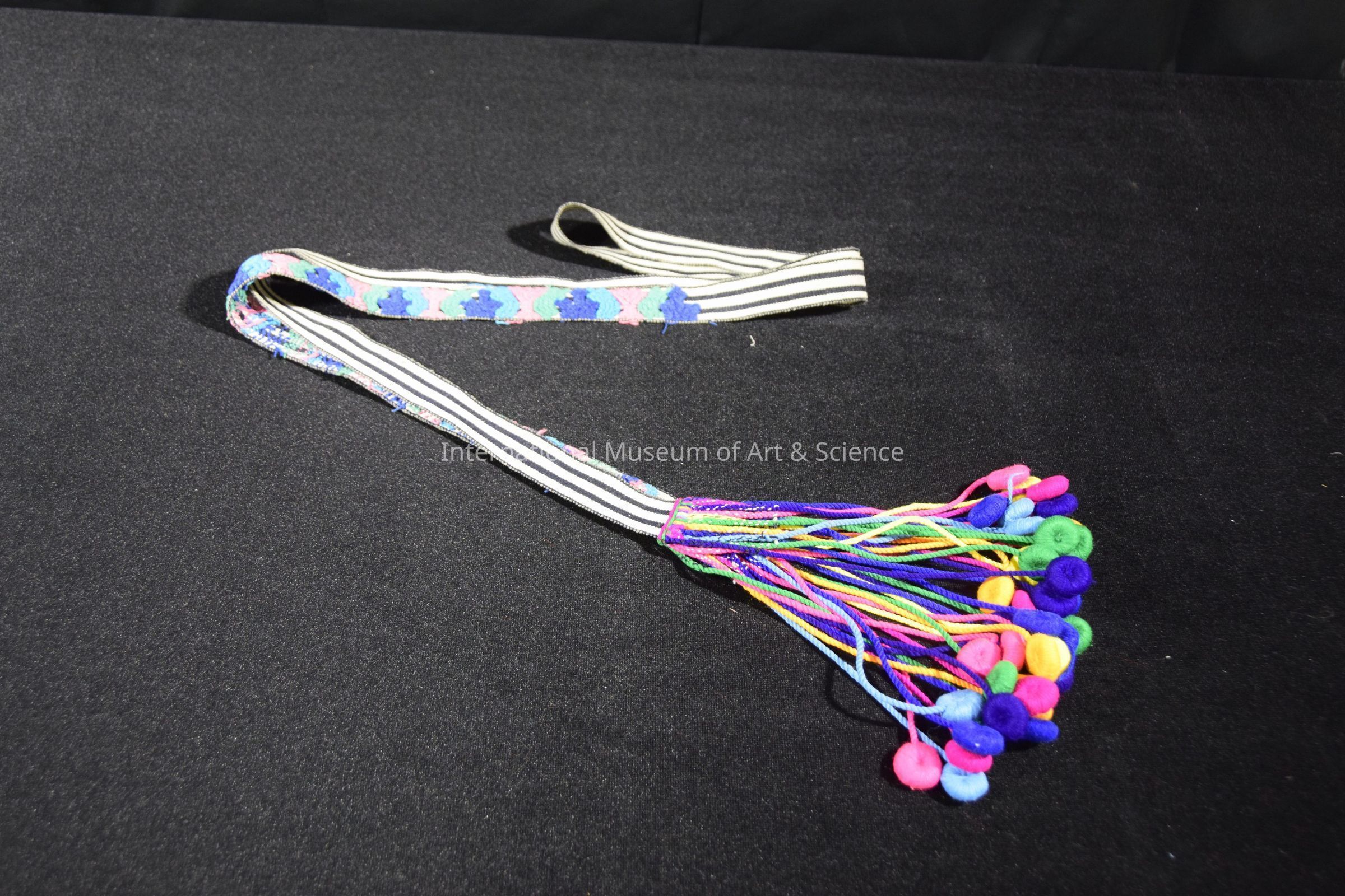 Cinta (hair ribbon). Center--striped: this pattern is nearly covered with geometric patterned embroidery for 16" at each end; ends--finished w/ twisted yarn & circular bobbles.Artwork Details
