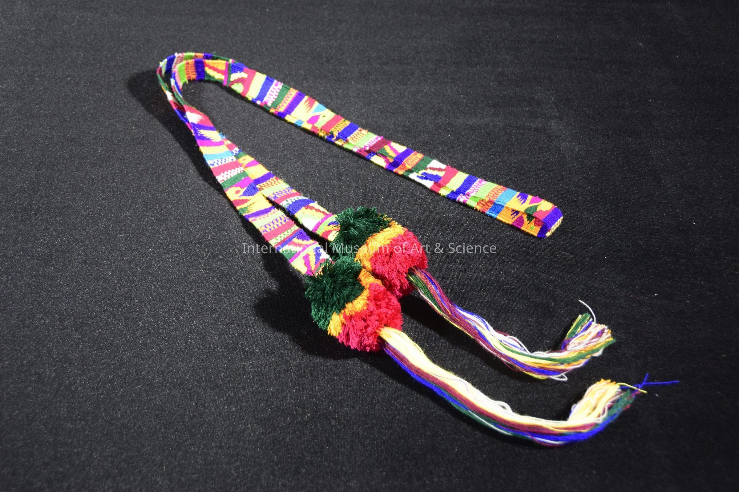 Cinta (hair ribbon). Small multi-colored bands in a variety of geometric patterns; Large green/red/orange poms w/ strings below.Dimensions