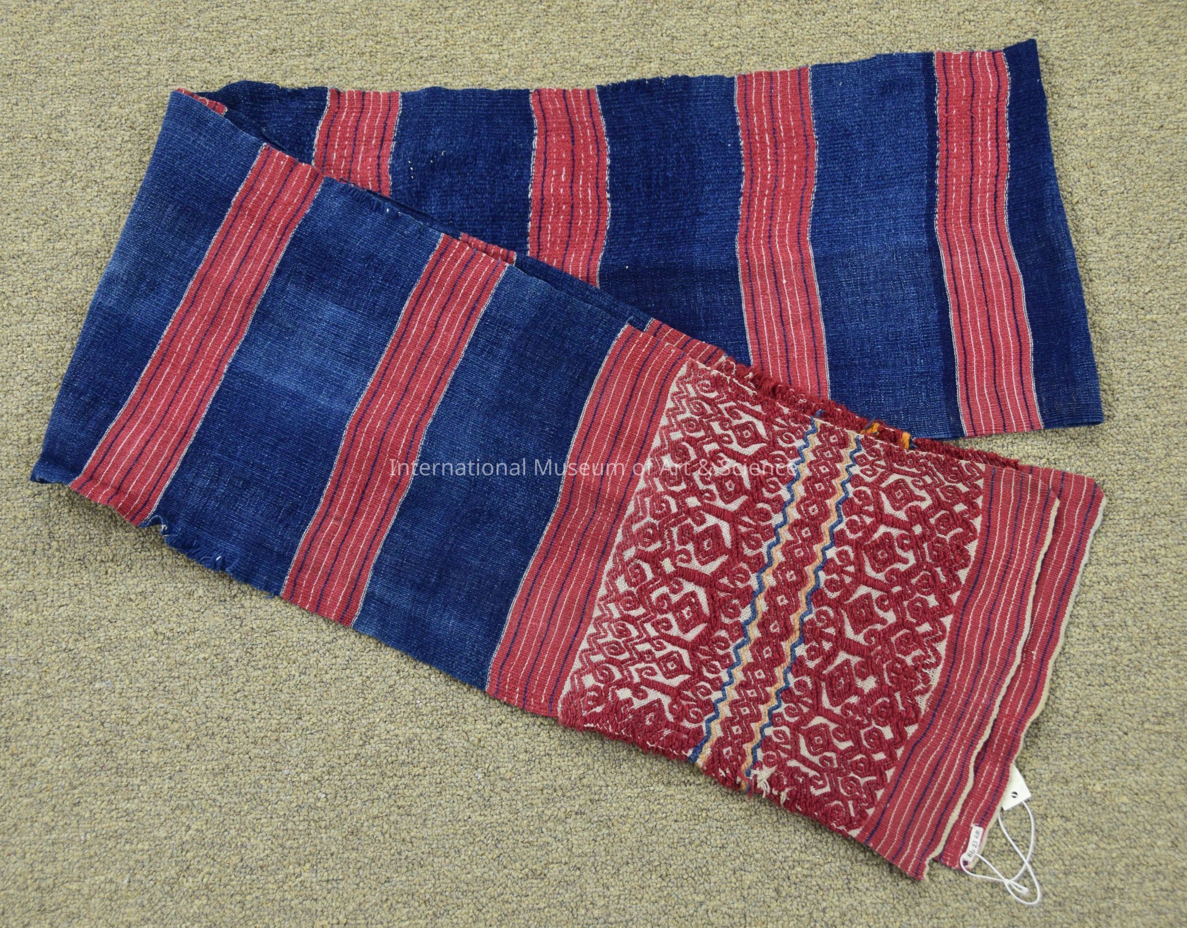 Man's belt/sash. Long, wide, hand woven rectangular textile piece with stripes and intricate geometric designs on its ends. The sash is overall indigo blue with crimson red stripes, and within each stripe are thin blue and white lines that run along it horizontally.