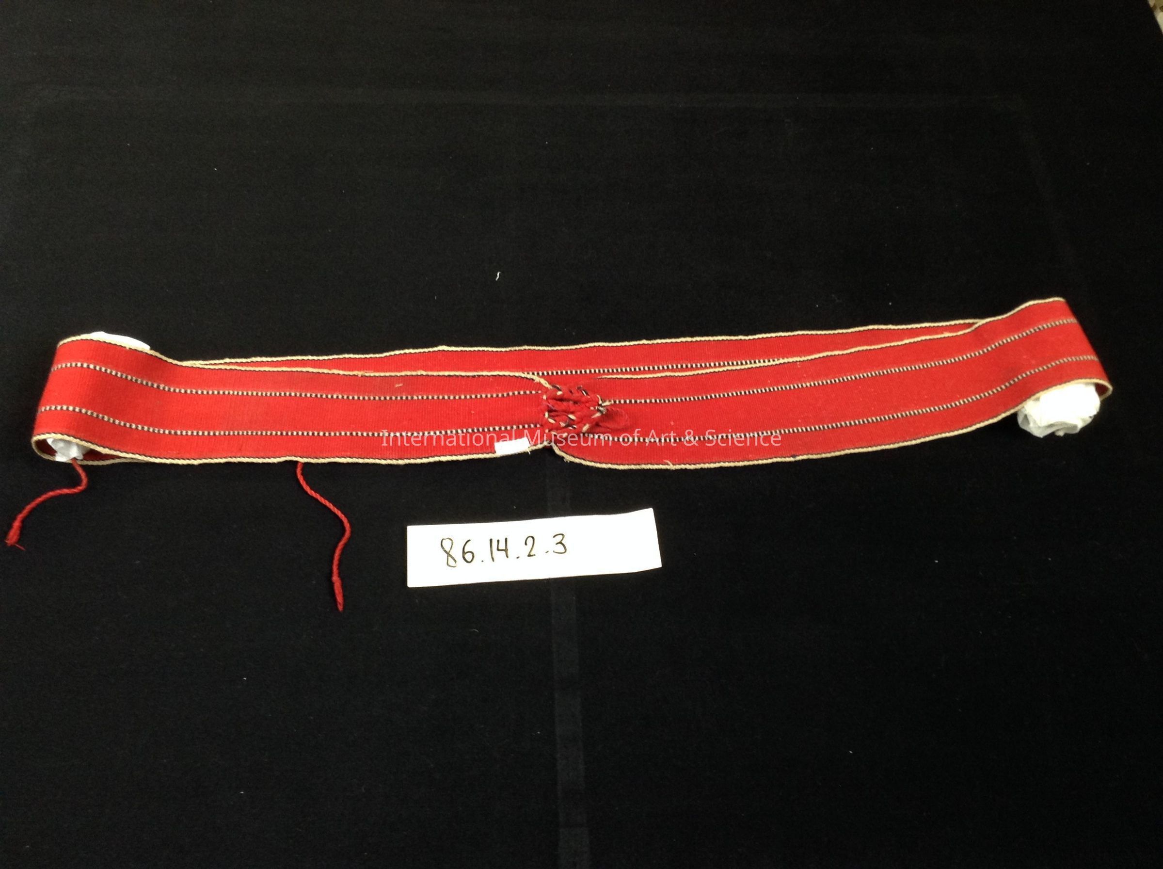 Woman's belt. Red cotton belt; black with beige horizontal bands; long twisted strings for tieing.