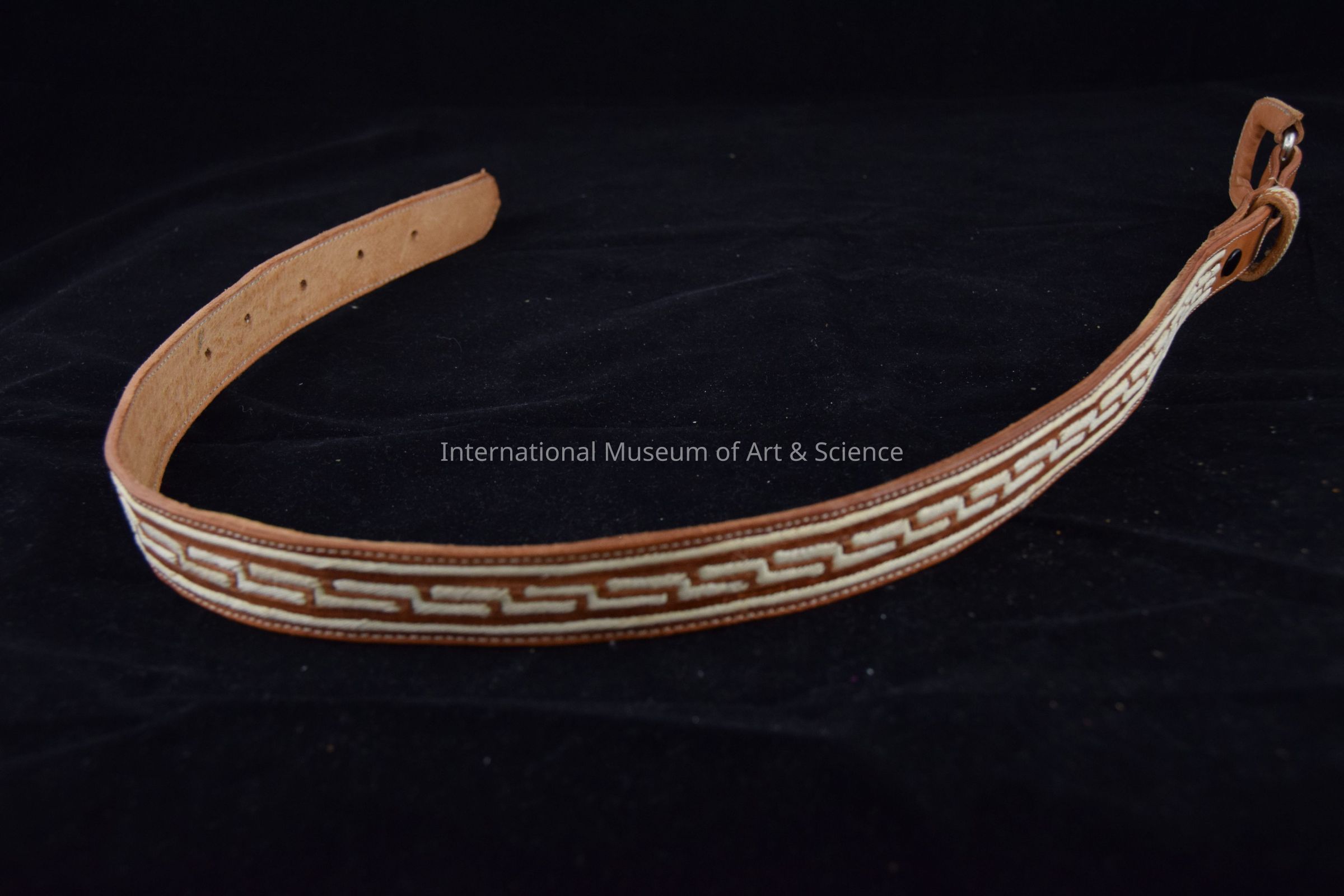 Long leather belt of natural brown with white fret designs; metal bucklcovered with leather and held together by black metal smaps; size 32 waist. 36" long x 3/4.Artwork Details
