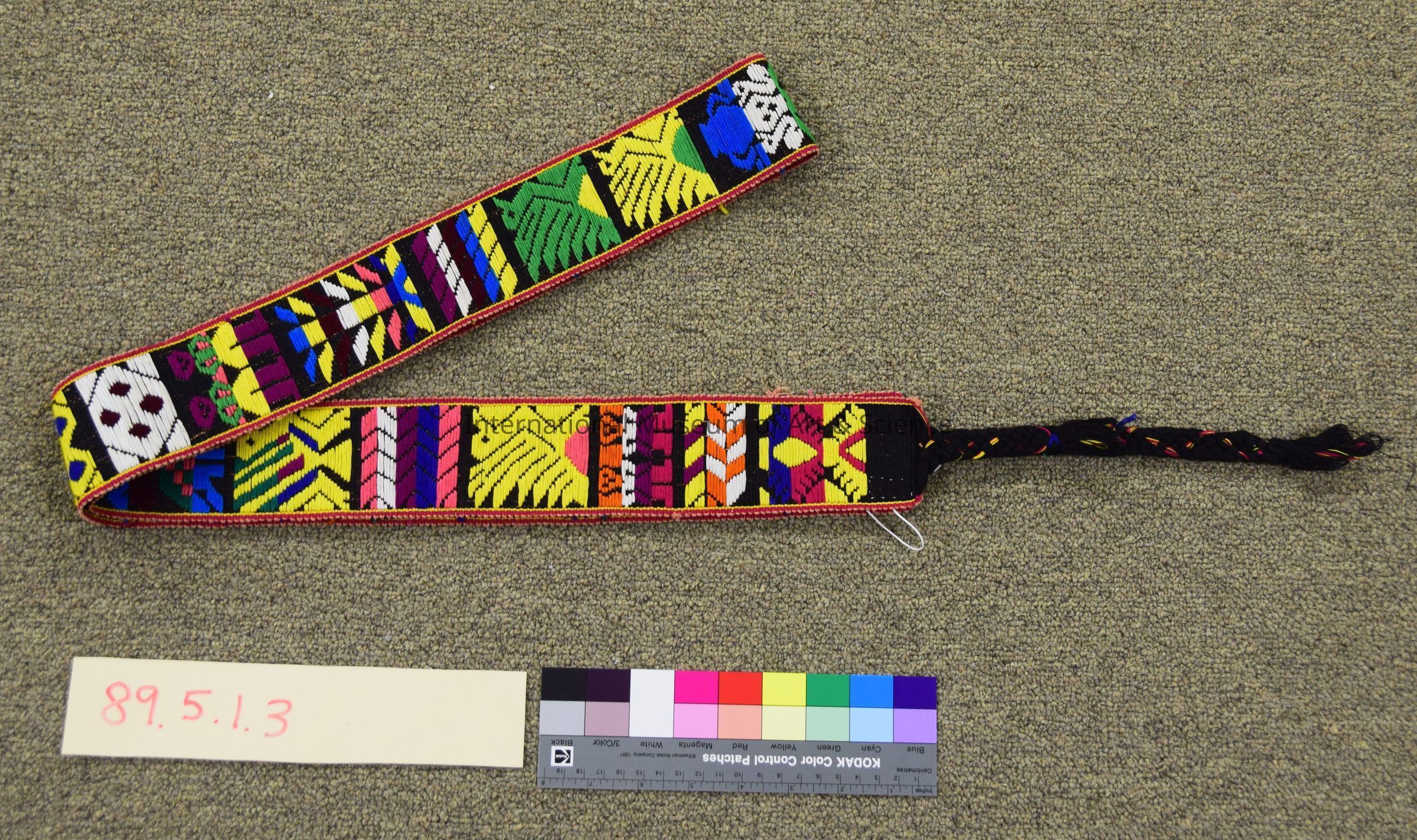 Hand woven belt. A light pink, thick cotton yarn makes up the belts weft; thinner black, pink and yellow threads run along the warp. The warp threads are braided on both ends of the belt, and one end is longer than the other. Multicolored figures, animals and geometric symbols are embroidered on the belt's entire length (in yellow, white, green, blue, pink, orange, plum, maroon).Artwork Details