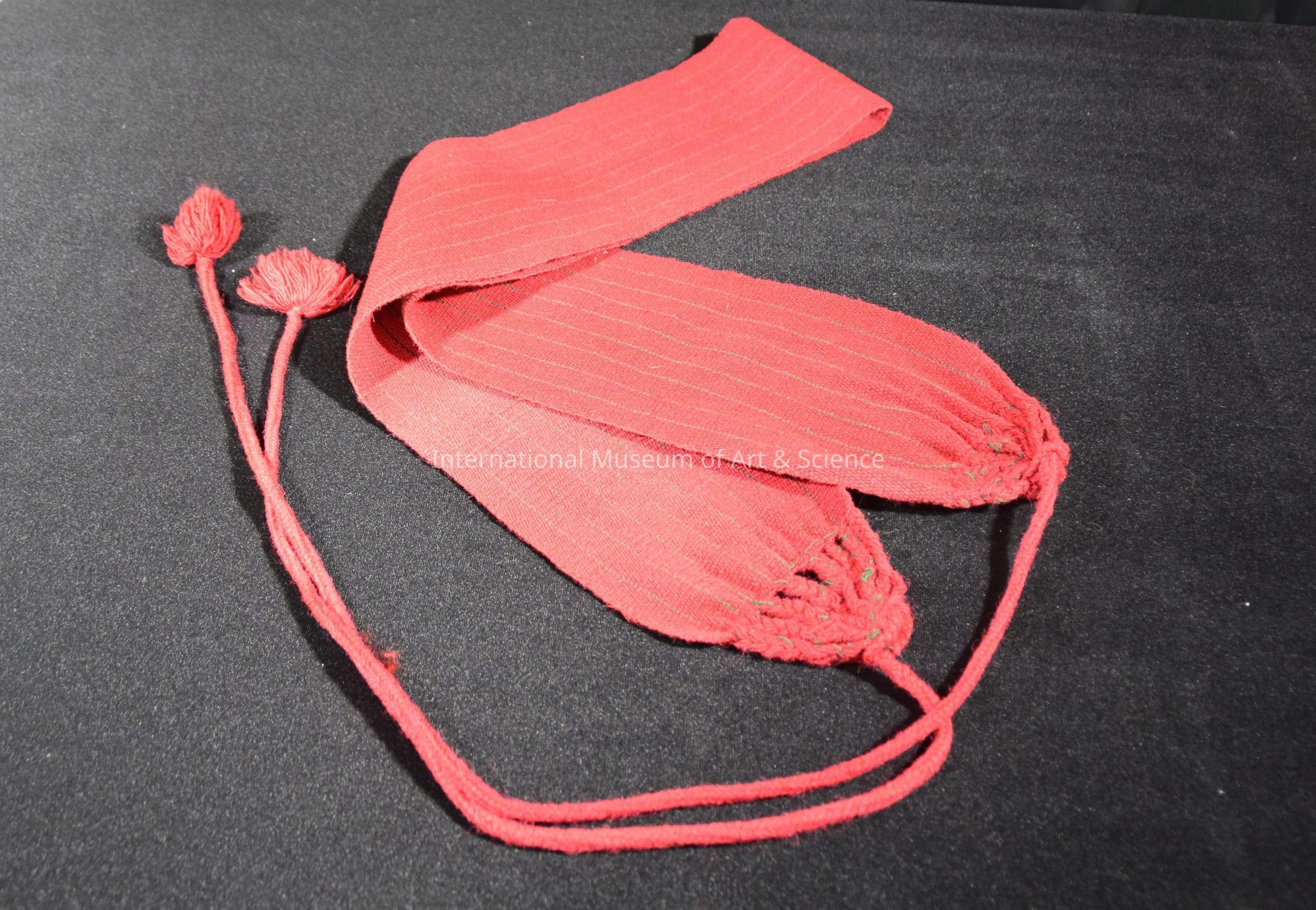 Faja (belt). 8 narrow green stripes against red; ends braided into one long rope, tasseled at the end.Ethnography
