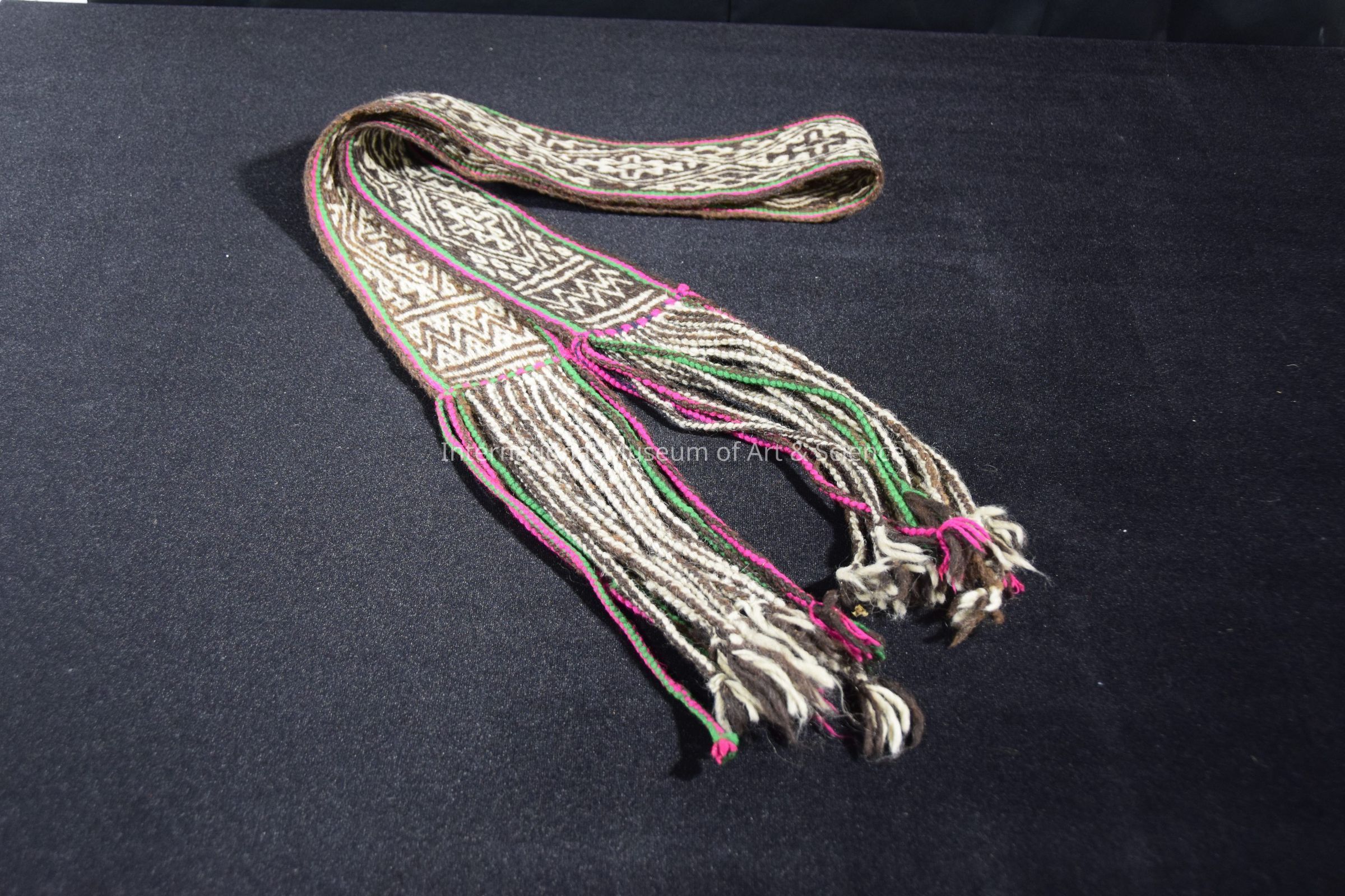 Faja (belt). Geometric pattern w/ repeating diamonds, long braided tassels. Natural brown& white synthtic pink and green