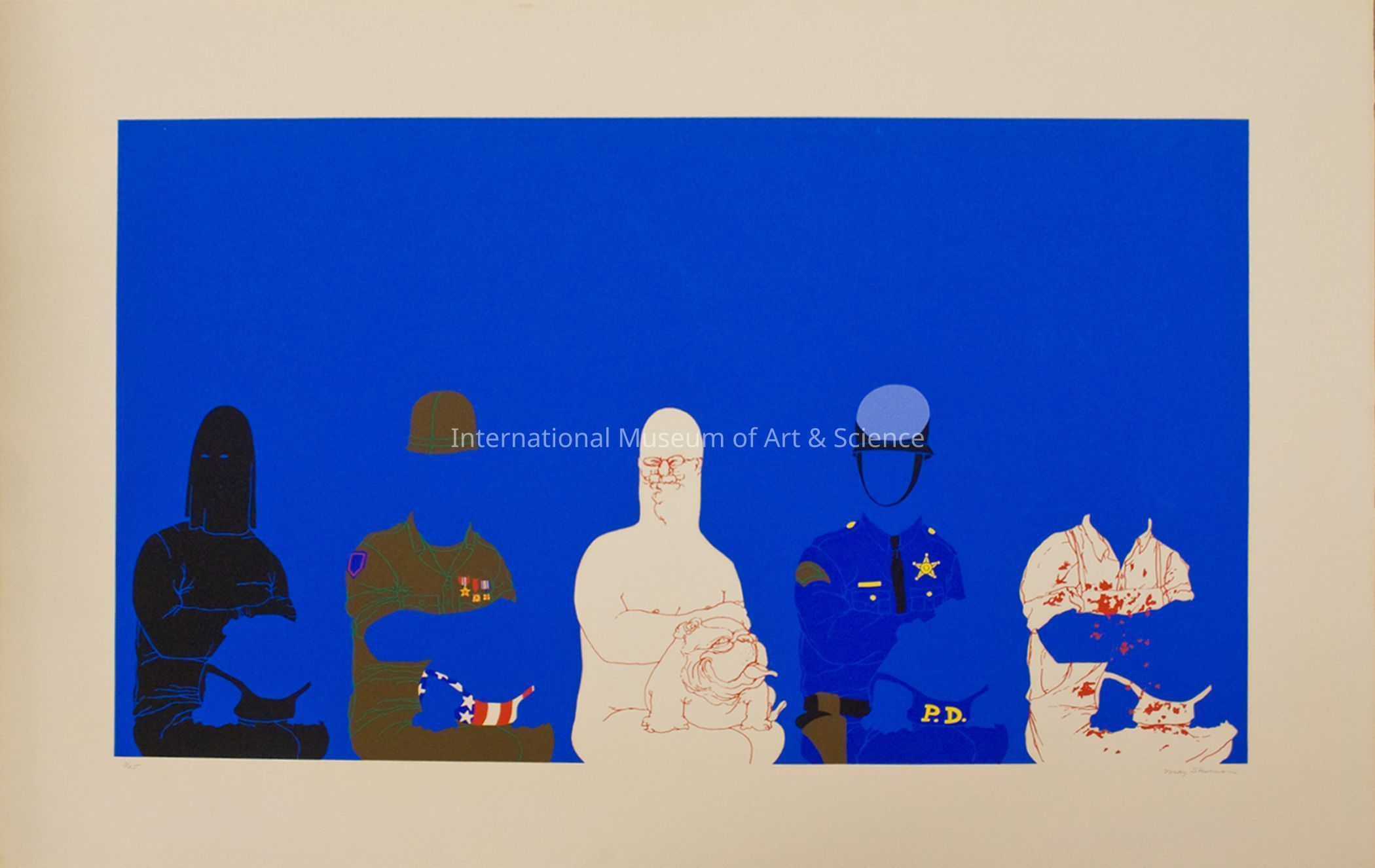 "Big Daddy Paper Doll". Blue background with cut out figures, central figure man with bulldog, signature on lower left.Dimensions