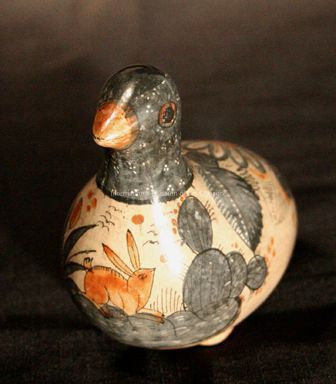 Bird; tan body with orange rabbit on breast; overall desert landscape design in greys; black/grey head with orange beak and dark orange eyes.
