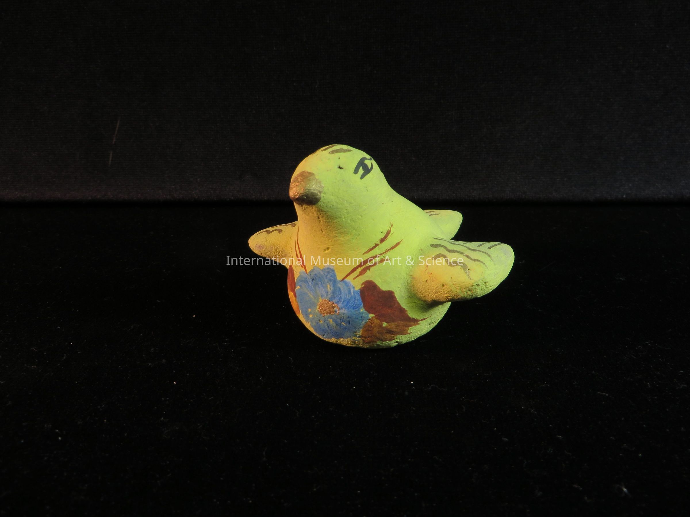Small bird made of clay, painted overall yellow with a blue flower, brown leaves; gold linear designs on wings, tail, crown, anf beak; black painted eyes.Dimensions