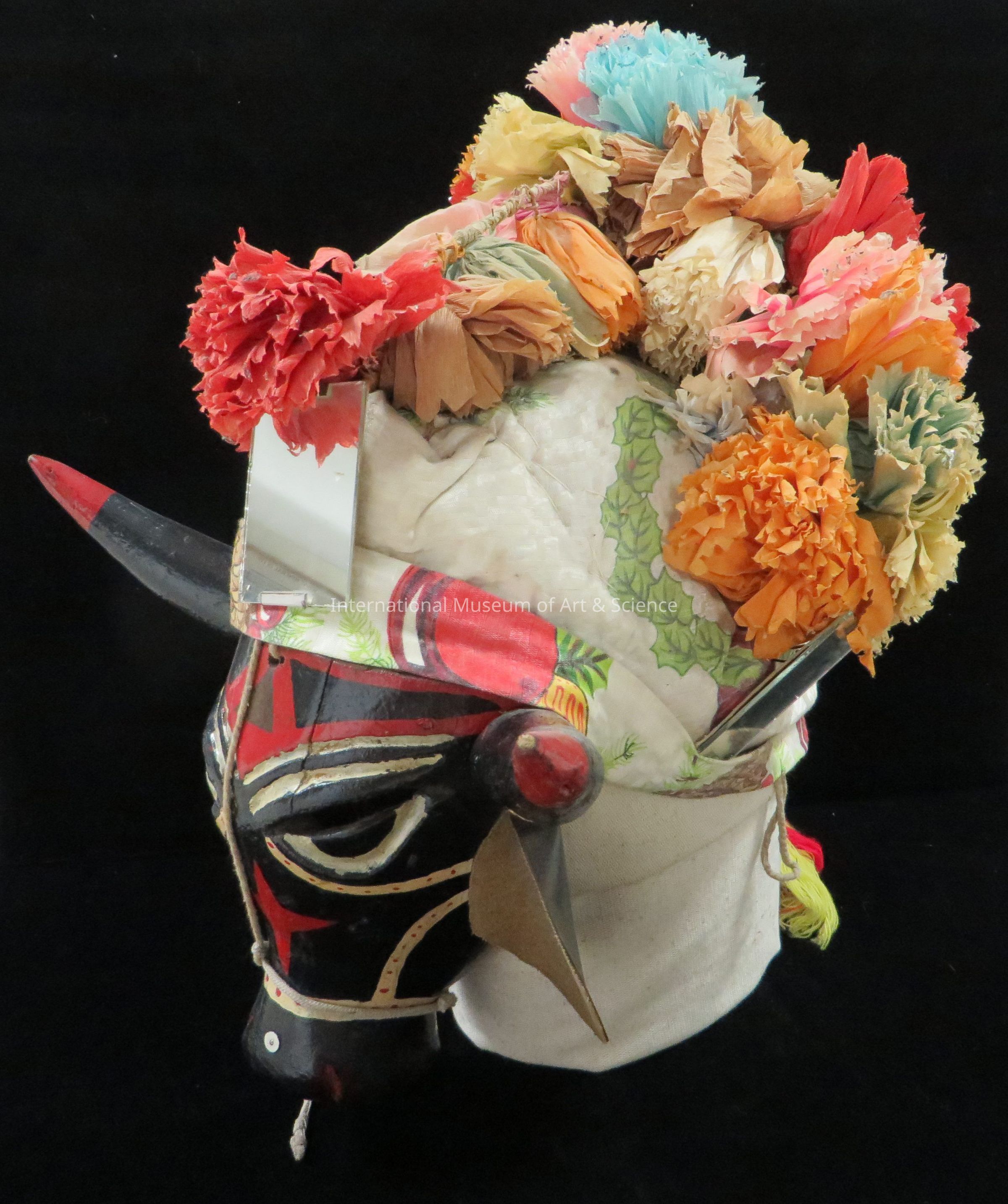Black bull mask. Red and yellow markings; red star center black horns; leather ears; headdress base of straw and cloth with paper flowers; four mirrors attached.Artwork Details