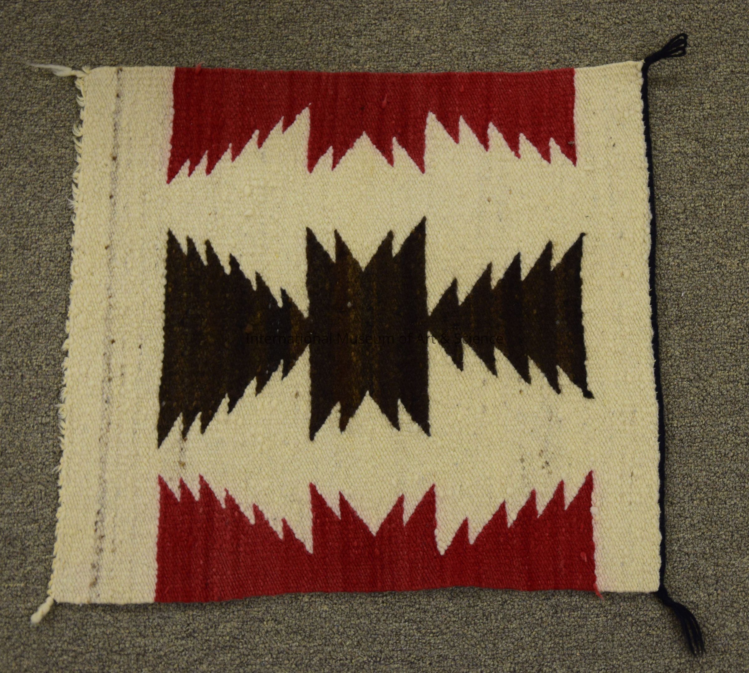 Saddle blanket. Thick, heavyweight wool blanket. Its yarns are dark brown, ivory and red. At center, in brown, is a rectangle with two serrated edges, surrounded top and bottom by two triangles with serrated edges facing each other. The two triangles almost look like simplified pine trees. This motif is repeated on either side of it in red and cut in half lengthwise. One black yarn runs along the top edge to clean finish it. Its medium is hand-spun wool and its technique is tapestry weave (weft-faced plain weave). Noting its smaller size, this object may be more on an ornamental basis than an actual saddle blanket.Dimensions
