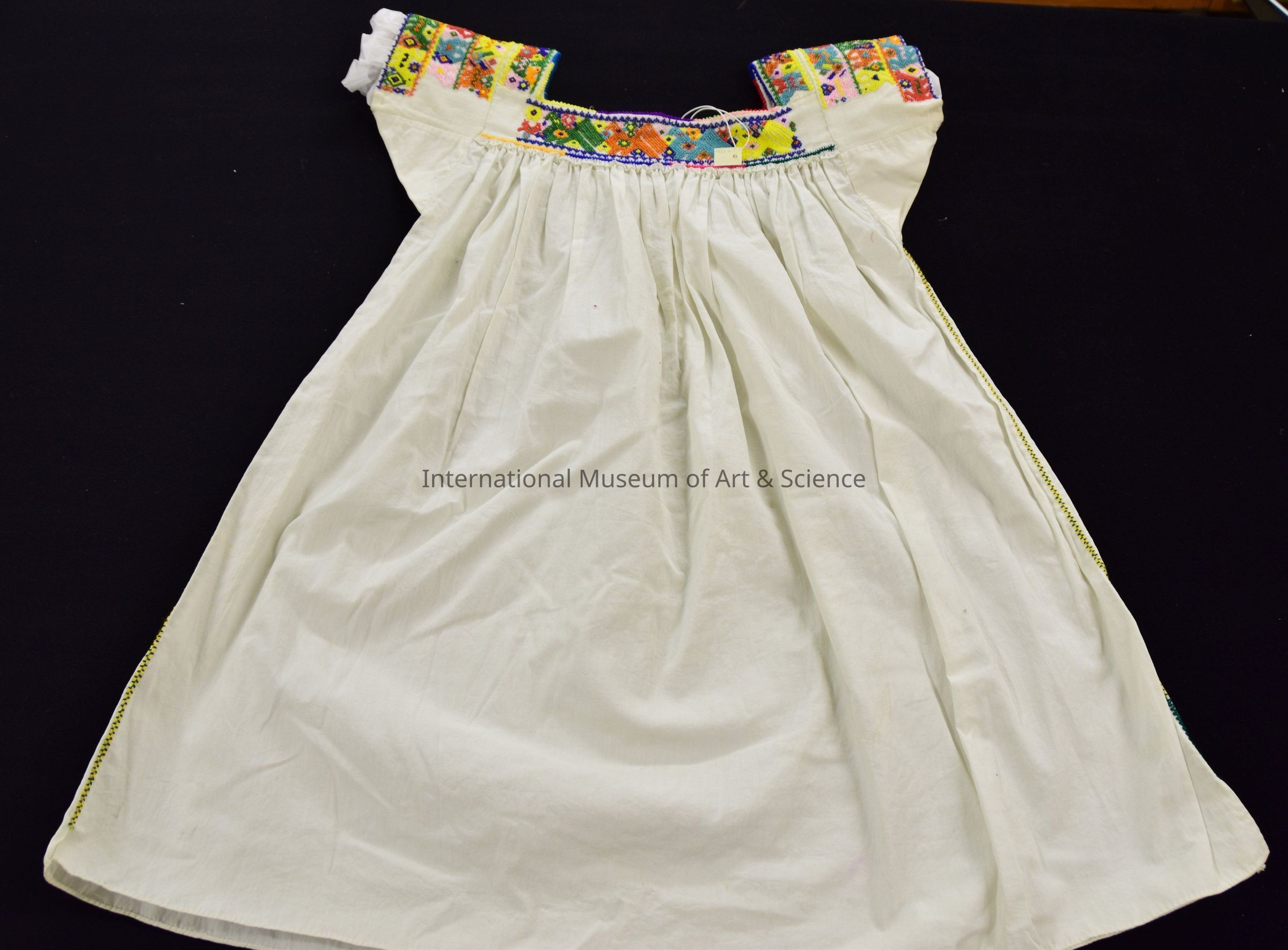 Blouse of white commercial cotton; herringbone stitched at sides in green/yellow;multi-colored beadwork. Salesperson I.D.ed as fiesta blouse to be worn with wide sash and akirt of blue/white wool or embroidered with animals. New piece following traditiDimensions