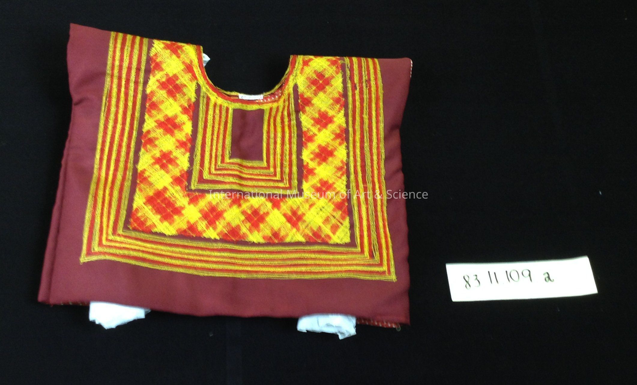 A blouse. Blouse of dark maroon with round neck. The blouse is lined with red fabric with white polka dots. The outside is decorated in machine embroidery patterns in red and yellow.Artwork Details