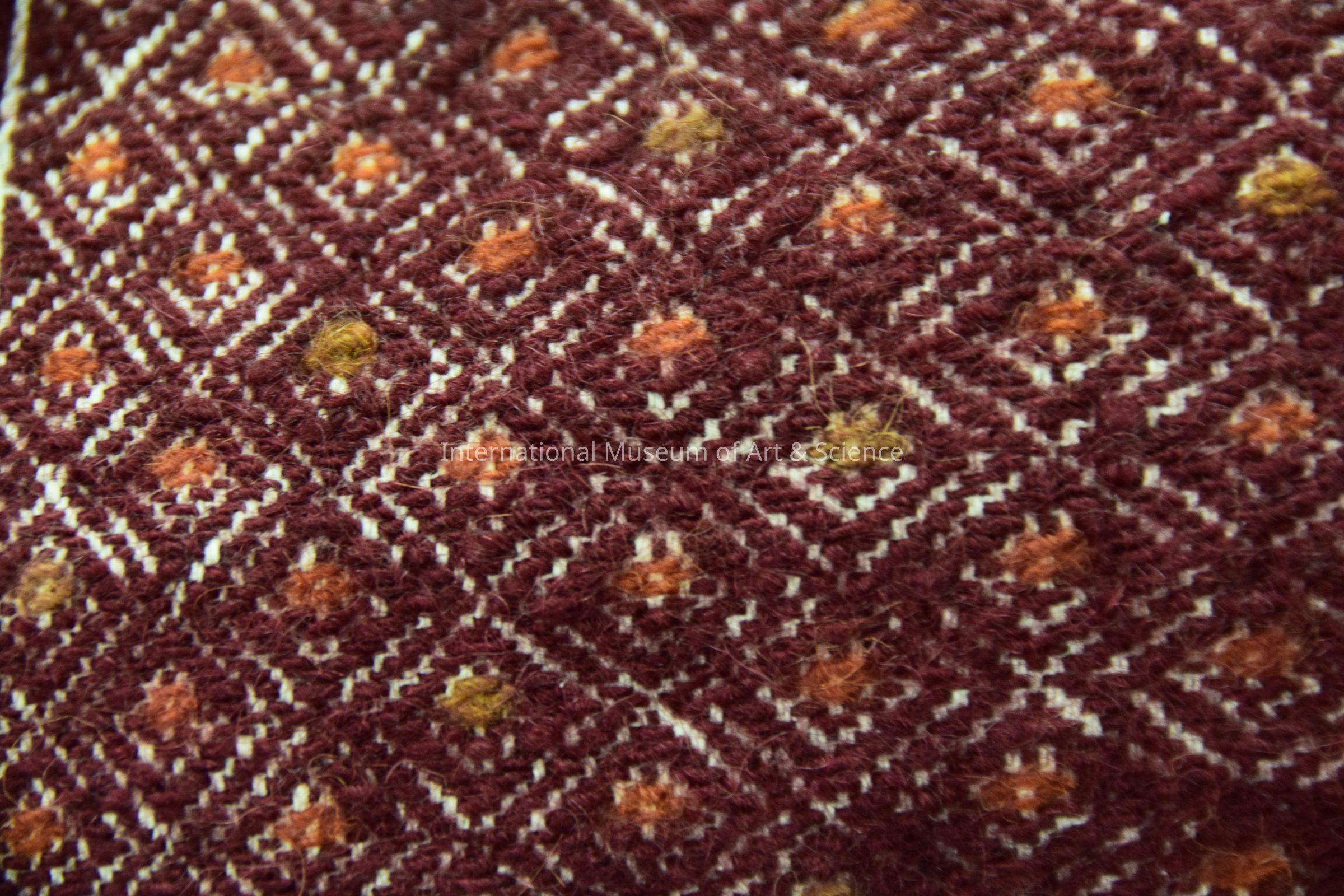 Huipil (blouse). Woven on backstrap loom from hand-spun cotton. Three webs of plain weave cotton sewn together with a catch stitching in maroon wool thread. The central web is twice the width of the sleeve webs, and has a small square neck opening. A brocade with geometric designs adorns the top section of each web--the central web thrice as long as the sleeves-- and extends from the front to the back. Although predominantly maroon, the brocade also has yarns in burnt orange, light gray, marigold yellow, and greenish-brown. The yarns are probably all handspun and colored with vegetable dyes.