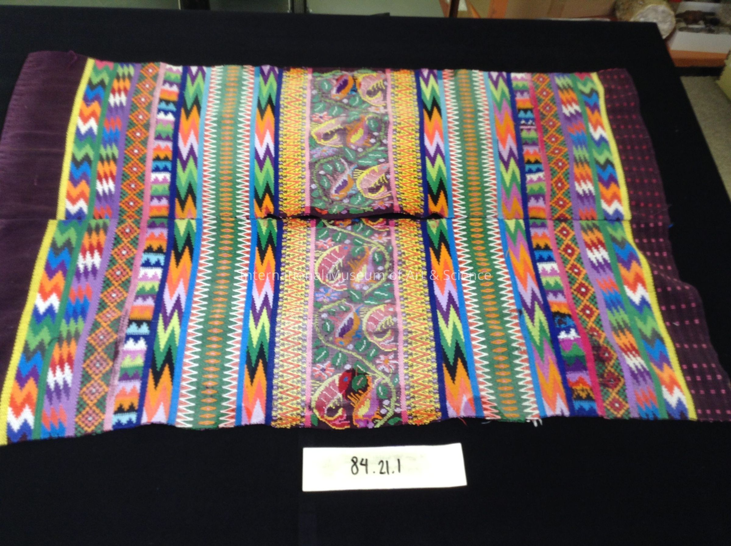 Huipil. Woven with backstrap loom, warp red weave; very colorful. At the shoulders are fish and floral designs. The rest of the blouse has zig-zag and diamond designs.Artwork Details