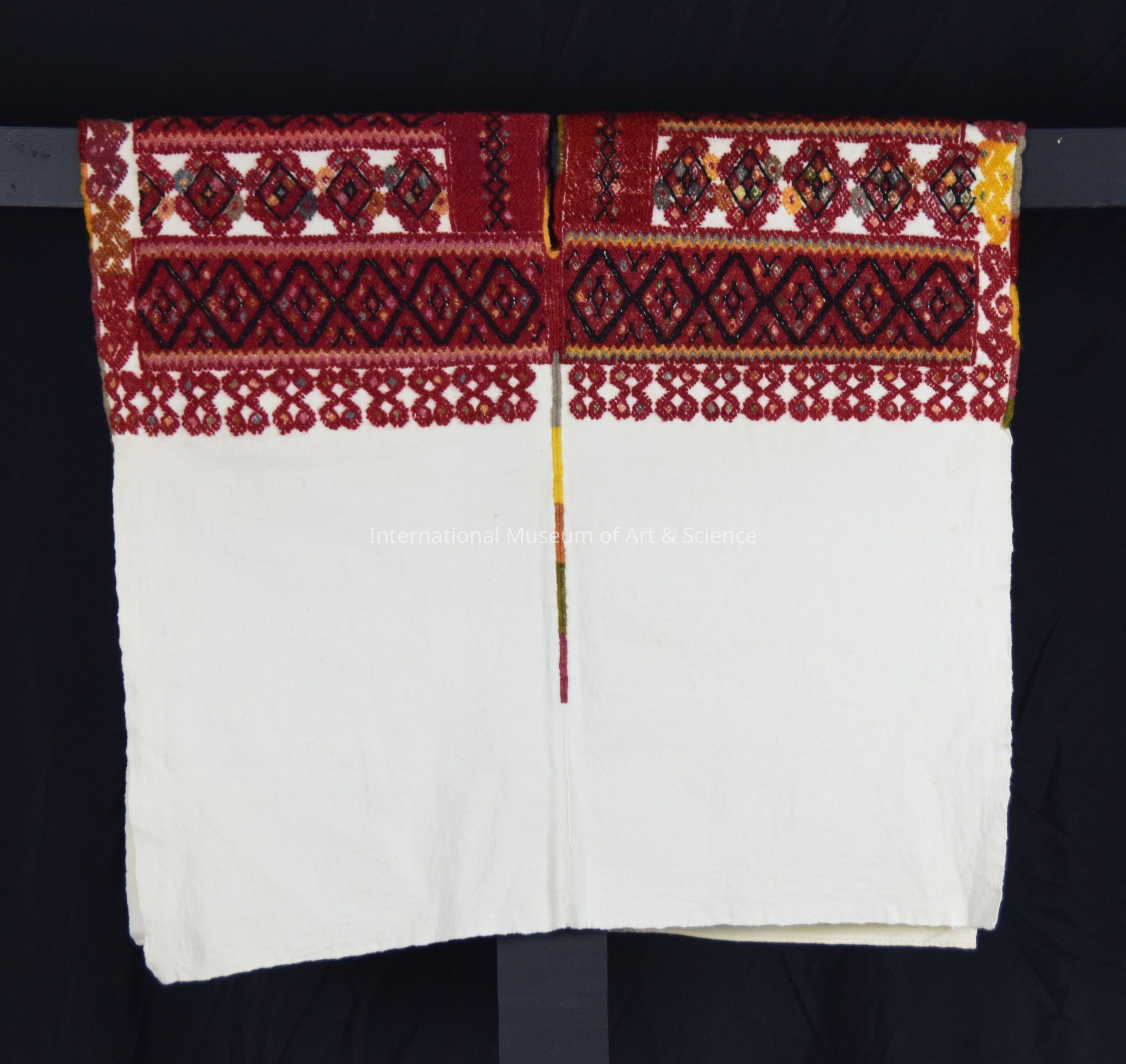 Huipil. White cotton blouse; top section covered with maroon and black wool design woven in floral and diamond key pattern; touches of yellow and gray; v-neck; sides open.Artwork Details