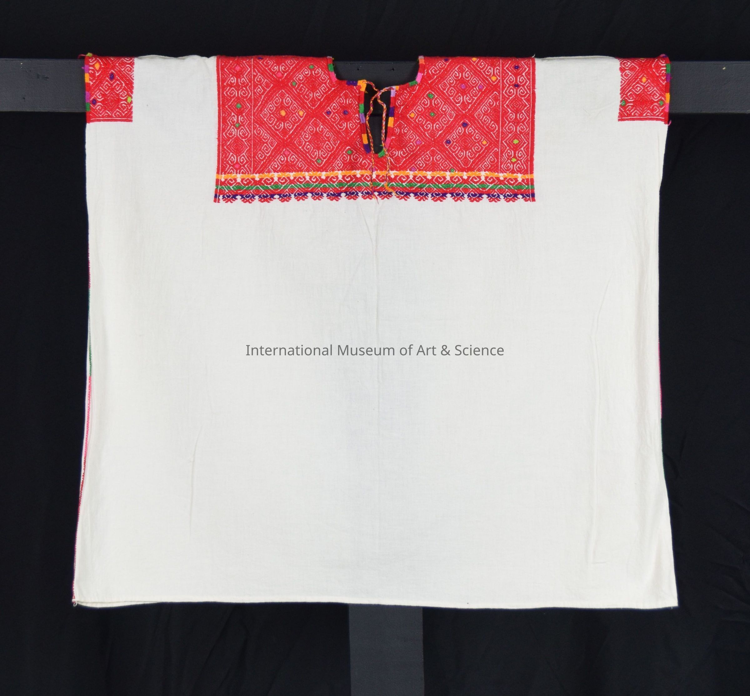 Blouse. White cotton blouse, square neck, red embroidered designs of diamond patterns; touches of orange-yellow, green, pink, & purple.