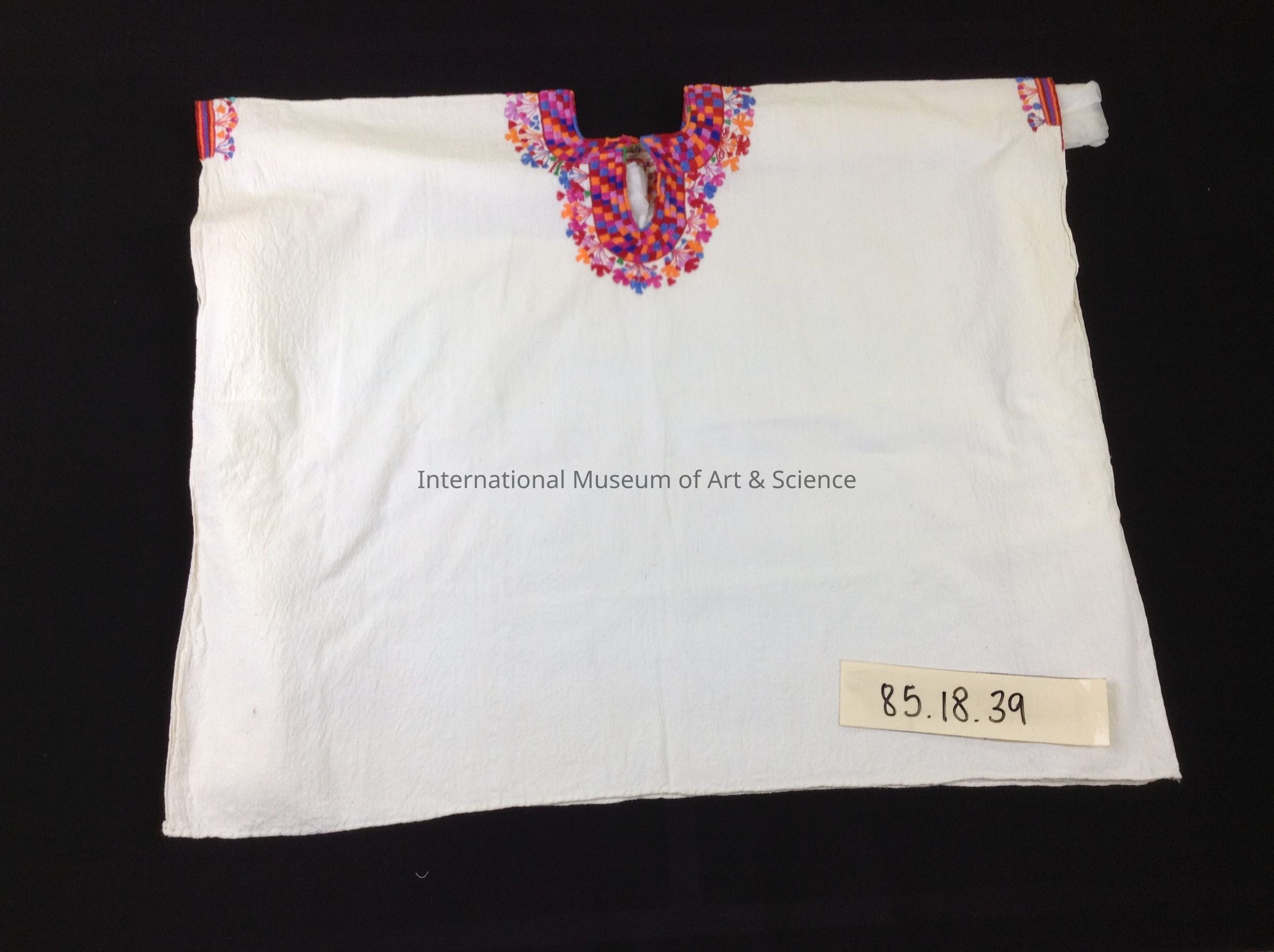 Blouse. White cotton blouse; square neck w/v-opening; bright multicolored embroidered floral and square motifs of violet, blue, orange & red.