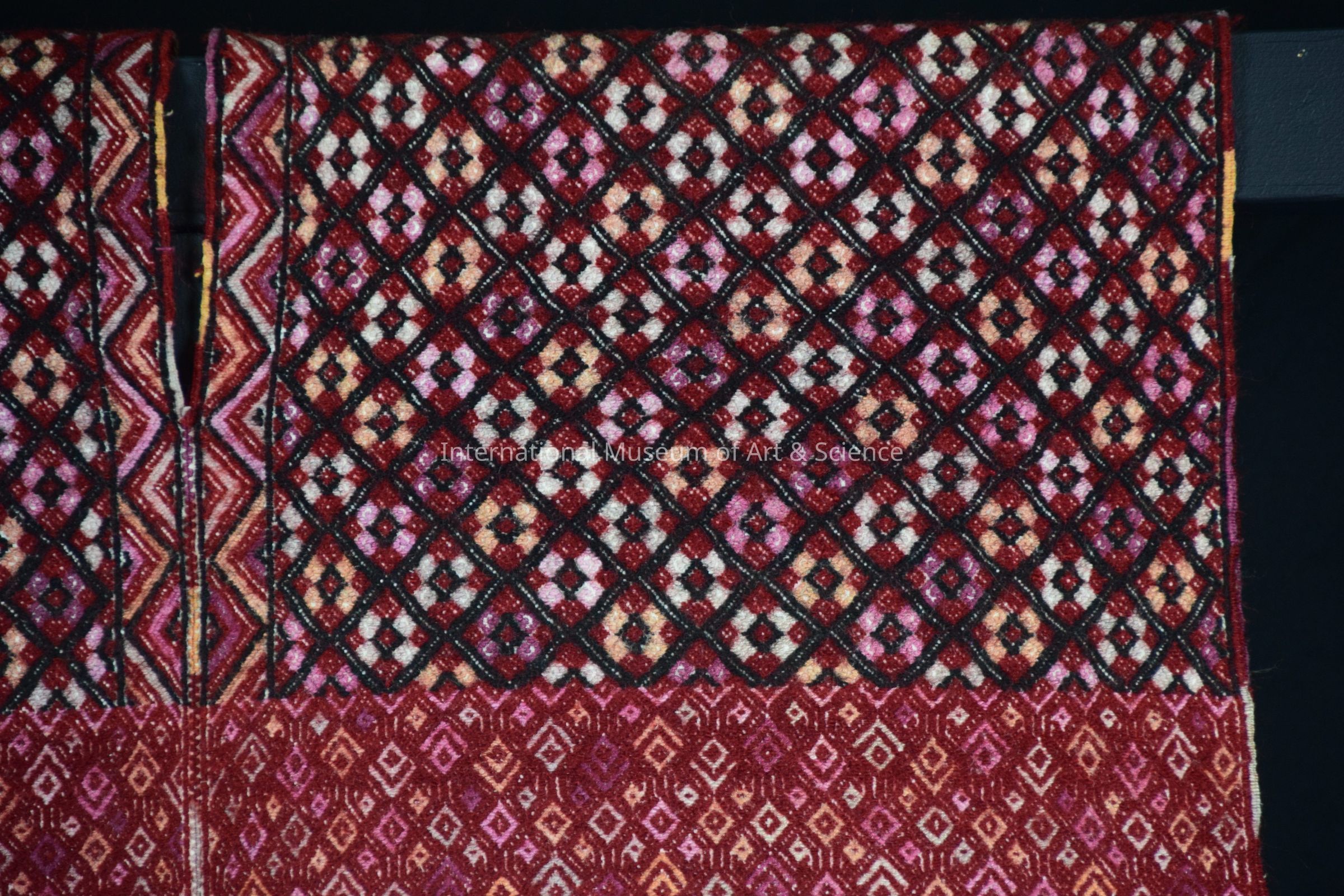 Huipil. White cotton blouse; top section covered with maroon and black woven design of diamond key patterns; touches of light pinak and peach; v-neck; sides open.Artwork Details