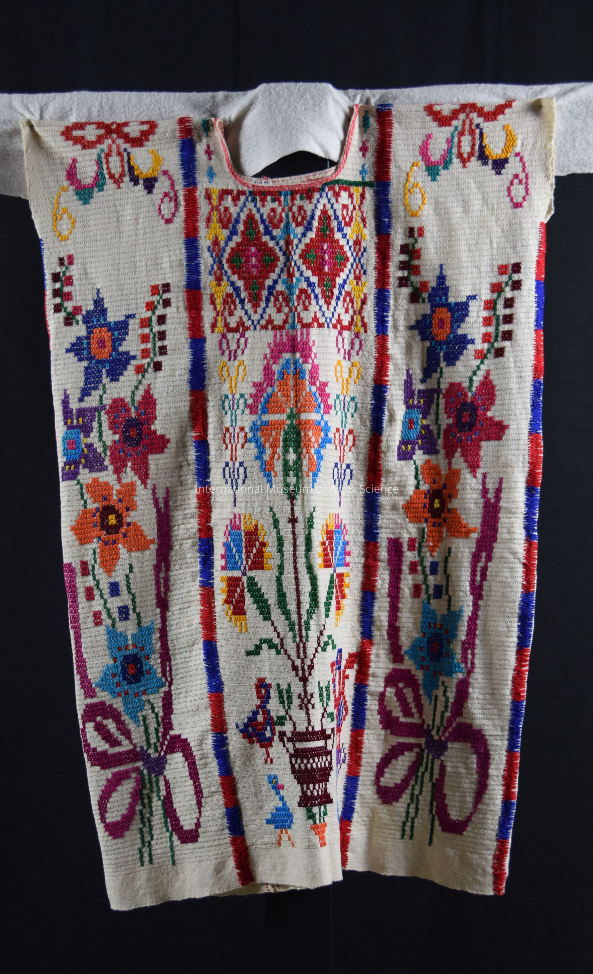 Huipil. Gauze-weave, natural colored cotton woven in 3 webs. Joined at sides and panel edges with joining stitch in alternating lengths of red and blue. Symmetrical placemnt of like designs on 2 outside panels, front and back. Bright multi-colored cross-stitched floral motifs. Center panel brightly cross-stitched with block of geometric designs below round neckline, front and back. Elongated flowers below this, bird motifs in bottom area.Made/Created
